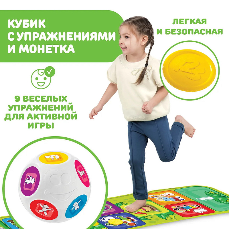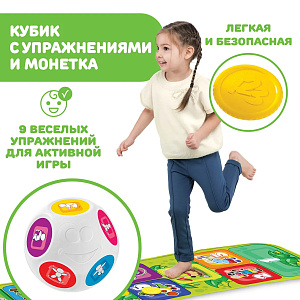 Всего на кубике изображено 9 упражнений, которые способствуют развитию моторных навыков и точности. Длина развивающего коврика: 150 см.