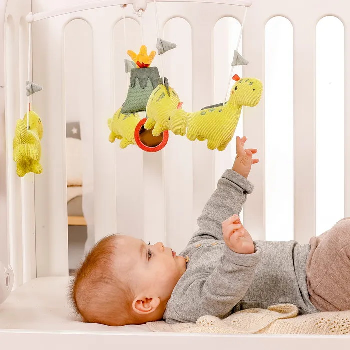 Мобиль легко и надежно крепится к кроватке. Динозаврики Диего и Армандо медленно вращаются под мелодию, увлекая за собой взгляд малыша. Ребенку будет интересно разглядывать фигурки и подвес-зеркальце, тем самым стимулируя воображение и развивая концентрацию внимания.