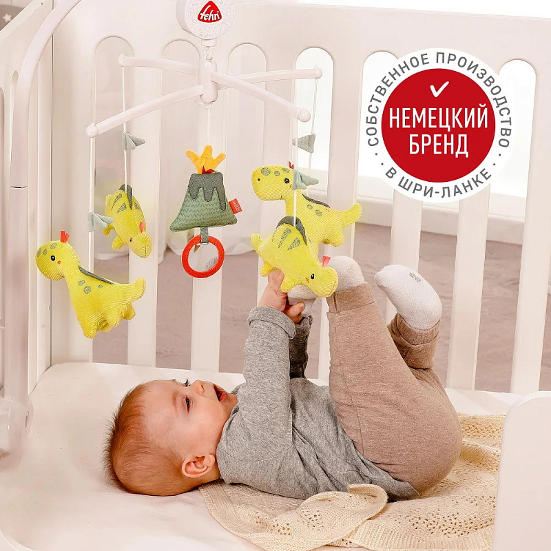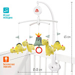 Музыкальный мобиль с очаровательными мягкими игрушками из коллекции Happy Dino. Приятная музыка «Колыбельная Брамса» помогает заснуть маленьким мечтателям. Время воспроизведения около 4 минут. Мелодию можно выключить, нажав на кнопку.