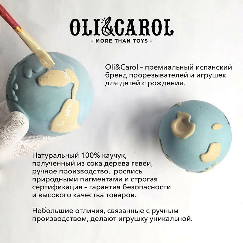 Прорезыватели для зубов Oli&Carol изготовлены из натурального каучука (сок дерева гевеи) и раскрашены вручную пищевыми красителями. Отсутствие отверстий делает игрушку безопасной и гигиеничной для игр во время купания, так как вода не попадает внутрь и не способствует образованию плесени.