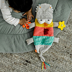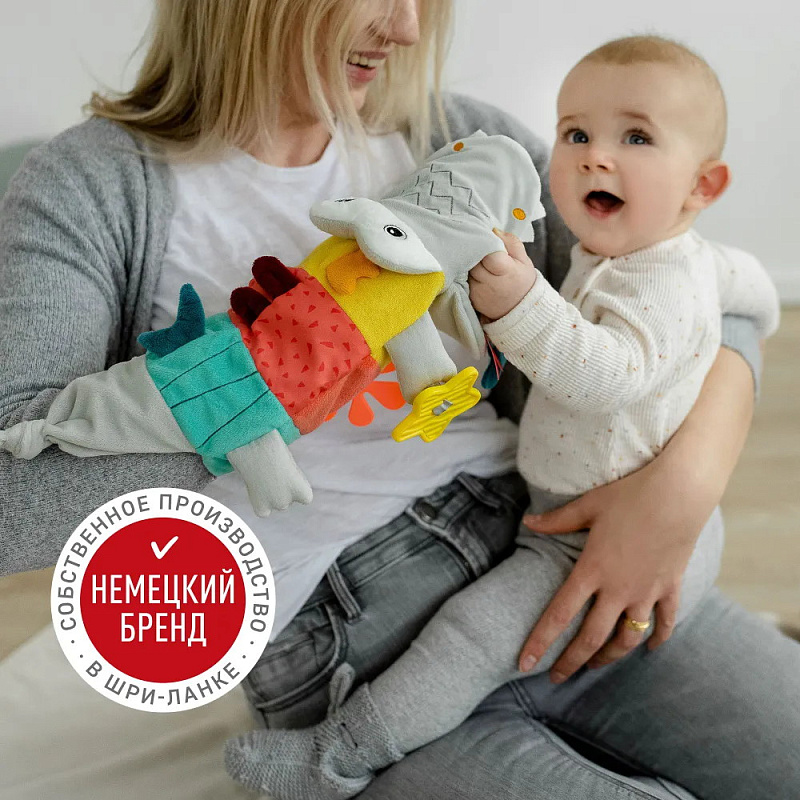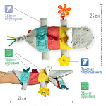 С такой игрушкой нескучно ни дома, ни в дороге. Погремушка, пищалка и шуршащие элементы в сочетании с яркими цветами пробуждают любопытство, развивают зрение, слух, мелкую моторику. Сочетание различных фактур ткани стимулирует тактильное восприятие.