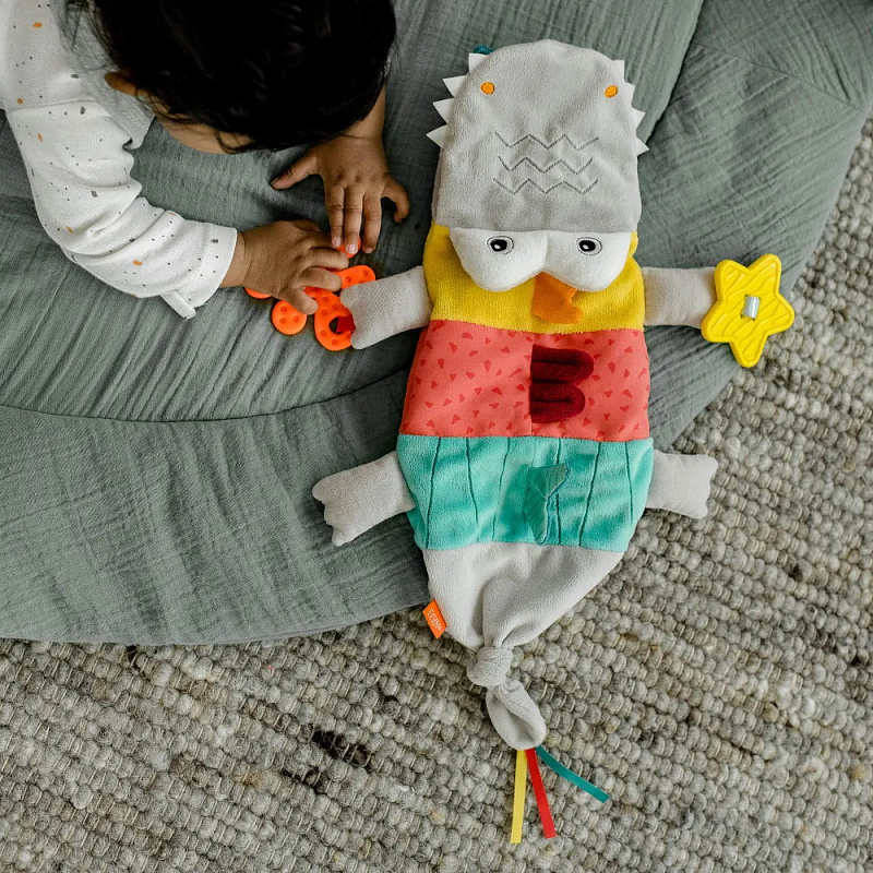 Игрушка мягкая и приятная на ощупь, малыш полюбит с ней обниматься и засыпать. Два цветных прорезывателя для зубов успокоят дёсны.