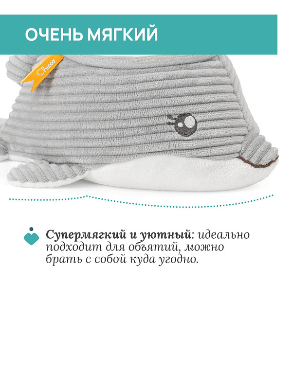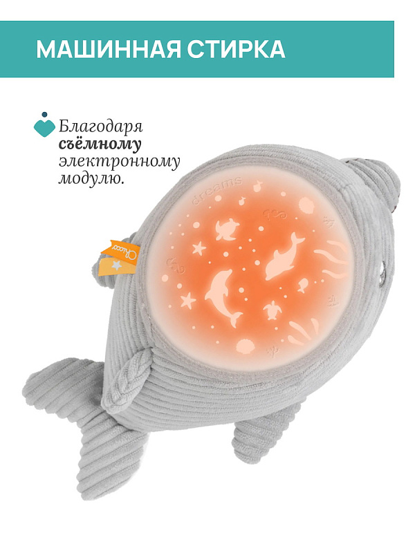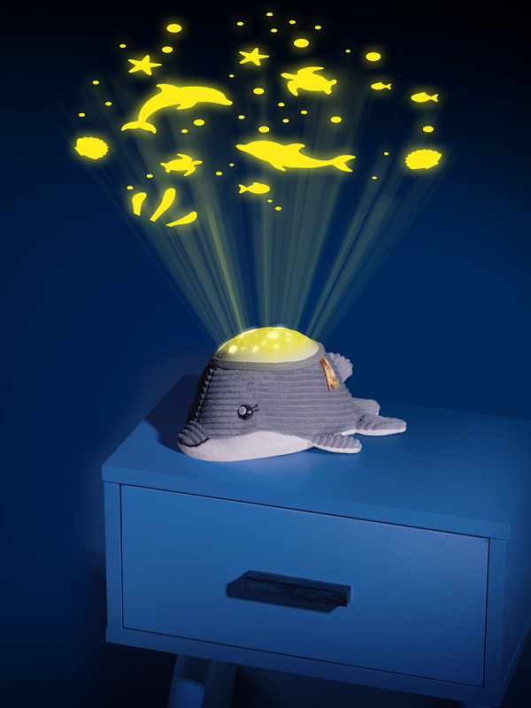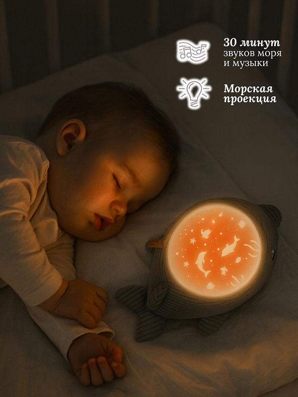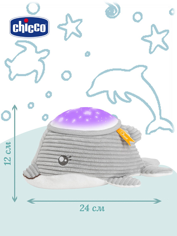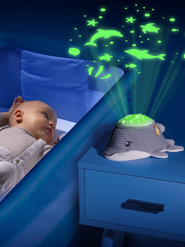 Игрушка-проектор Chicco «Дельфин» с морской проекцией и мелодиями создаёт для малыша спокойную атмосферу перед сном. Она сочетает мягкие световые эффекты, природные звуки моря и классическую музыку, помогая ребёнку расслабиться и быстрее уснуть. У игрушки два режима работы: проекция с мелодиями или только проекция. В течение 30 минут комнату освещает мягкая морская проекция с автоматической сменой семи цветов. Звуковое сопровождение включает 30 минут природных звуков моря — шум волн и звуки морских птиц — а также полноценный блок классической музыки. В игрушку встроен мягкий белый шум морской тематики, который действует как звуковое «одеяло» и помогает малышу отдохнуть, приглушая посторонние раздражающие звуки.