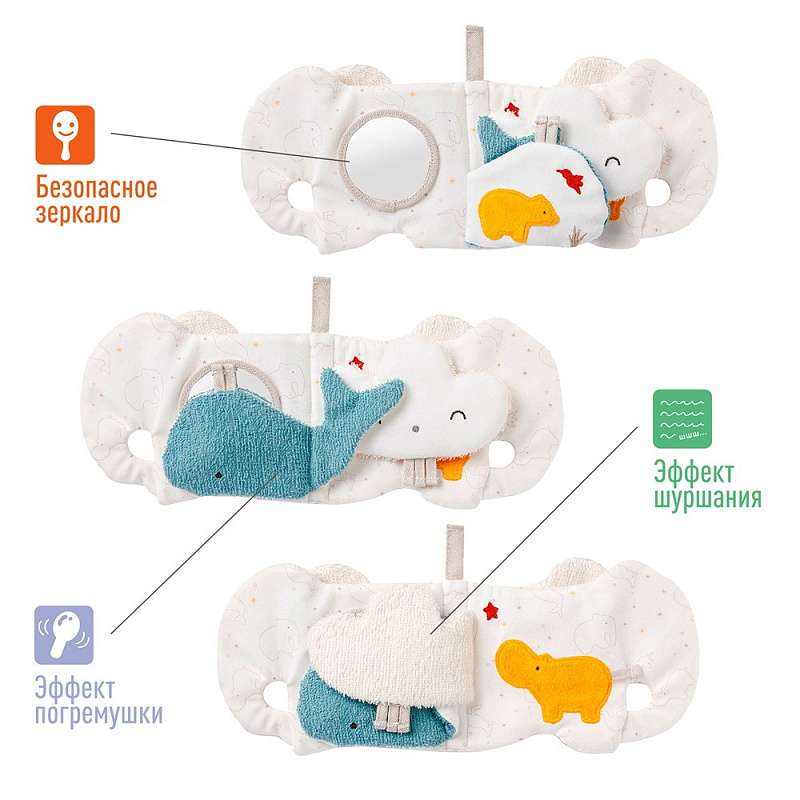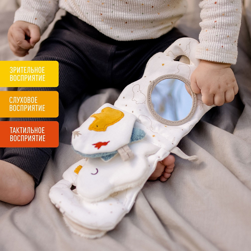 Обучаемся, играя – ребёнок с удовольствием будет разглядывать, щупать и изучать страницы, ведь на каждой есть какой-то секрет: шуршащие элементы, зеркальце, погремушка. Такая игрушка-книжка способствует развитию хватательных навыков, зрительного и слухового восприятия, мелкой моторики. Разные фактуры ткани стимулируют тактильные ощущения.