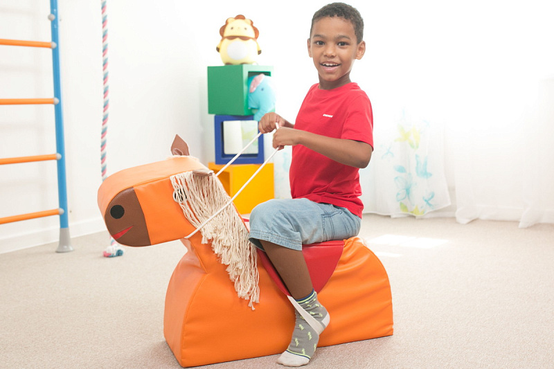 Выполнен в форме забавной лошадки со стременами и уздечкой и имеет устойчивую конструкцию – ребенок надежно сидит в седле и случайно не упадет в процессе активности. Изготовлена из поролона и обтянута приятной на ощупь винилискожей – безопасна для игр и не вызовет травматизма ребенка.