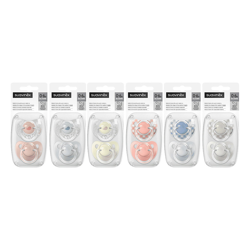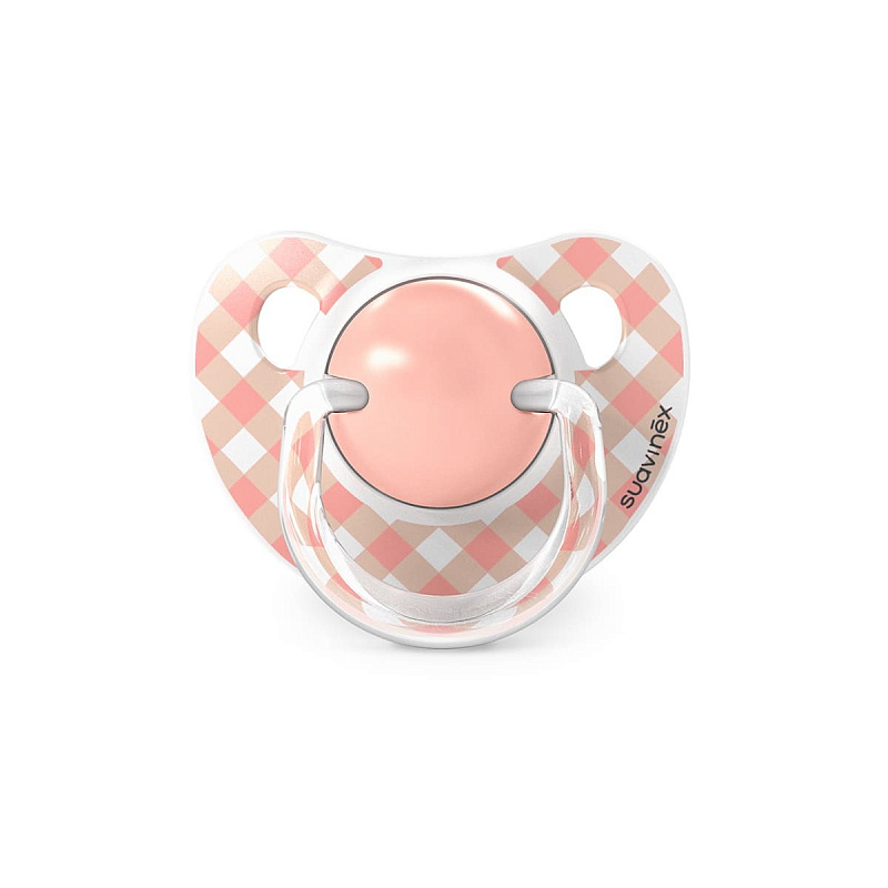 Анатомическая пустышка Suavinex с соской со скошенным краем анатомически правильно располагается во рту ребенка, не препятствуя естественному развитию ротовой полости и прикуса.