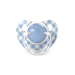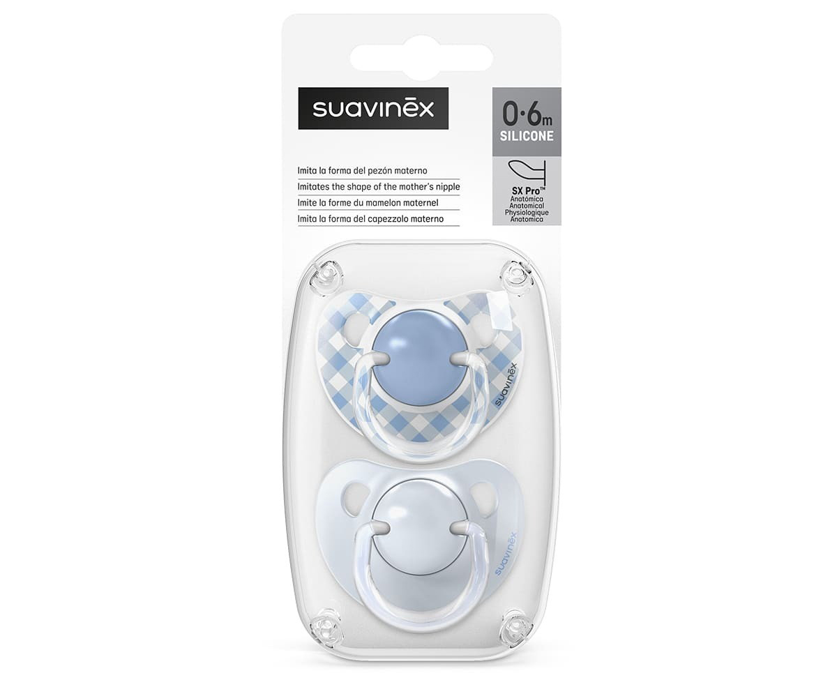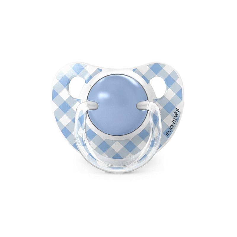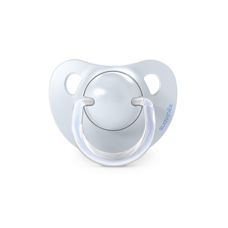 Анатомическая пустышка Suavinex с соской со скошенным краем анатомически правильно располагается во рту ребенка, не препятствуя естественному развитию ротовой полости и прикуса.