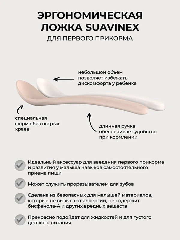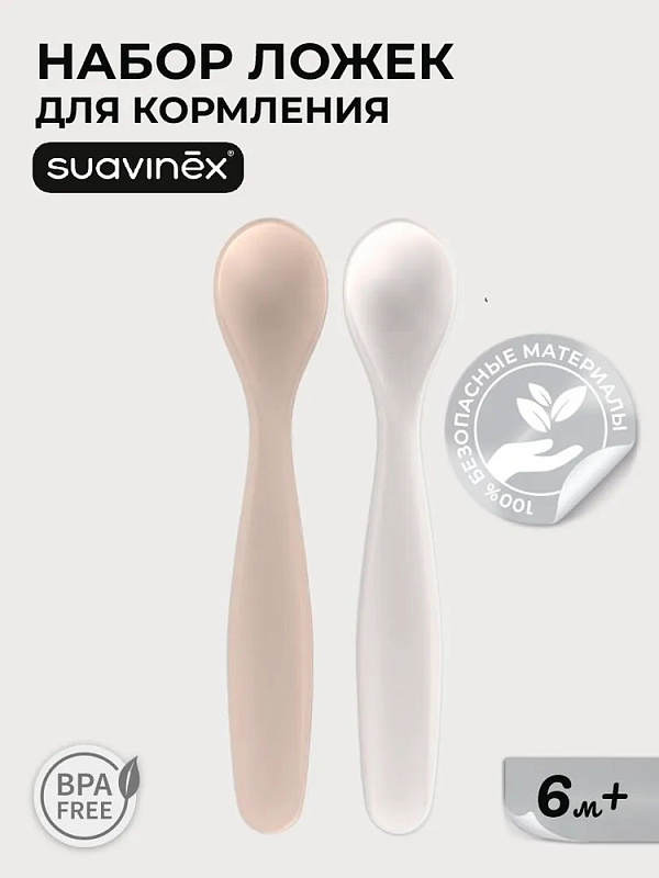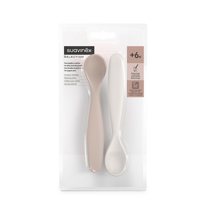Набор из 2-х ложек SUAVINEX идеально подойдет для начала прикорма и развития у малыша навыков самостоятельного приема пищи. Длинная широкая удобна и родителям, и малышу, который приучается есть самостоятельно. Кроме того, такая ложка позволяет доставать до дна даже самых глубоких баночек и тарелочек.