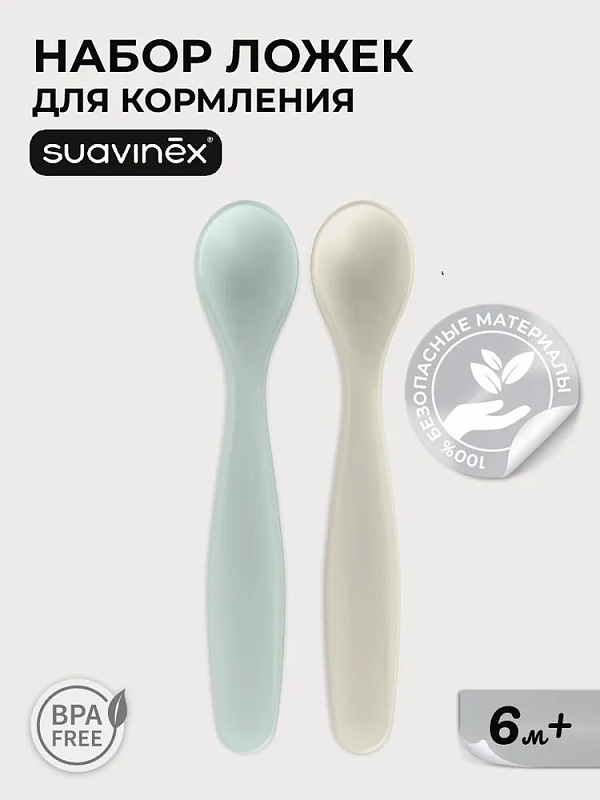 Набор из 2-х ложек SUAVINEX идеально подойдет для начала прикорма и развития у малыша навыков самостоятельного приема пищи. Длинная широкая удобна и родителям, и малышу, который приучается есть самостоятельно. Кроме того, такая ложка позволяет доставать до дна даже самых глубоких баночек и тарелочек.