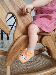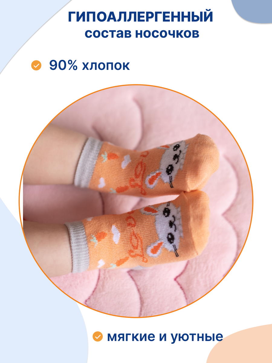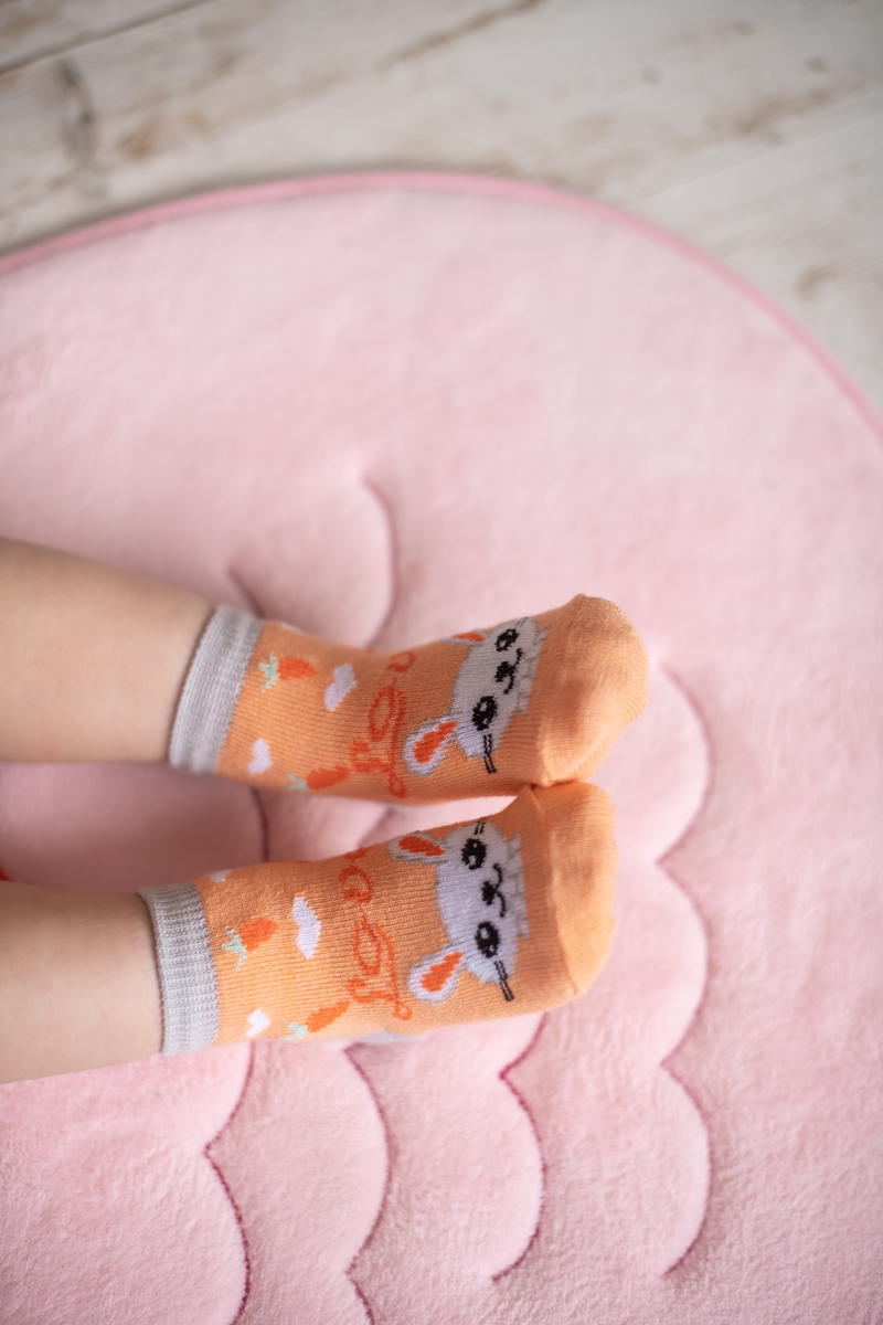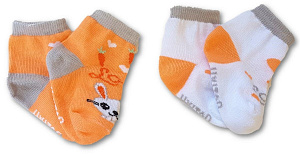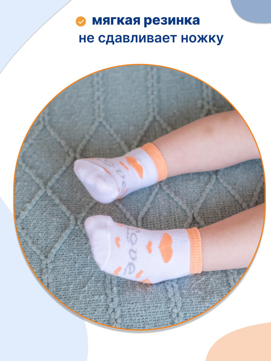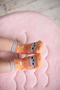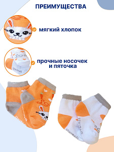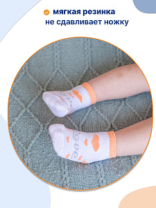Нежно-белый цвет изделия в сочетании с оранжевым, с красочным рисунком выглядит очень привлекательно. Комплект состоит из 2 пар, которые отличаются по дизайну, но дополнят друг друга по цветовой гамме. Текстура носочка очень мягкая, нежная, что гарантирует вашему малышу комфорт при носке. Резинка не стягивает ножку, но при этом отлично фиксирует.