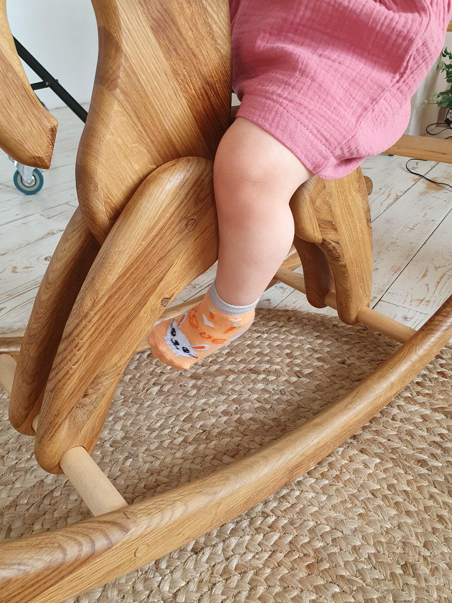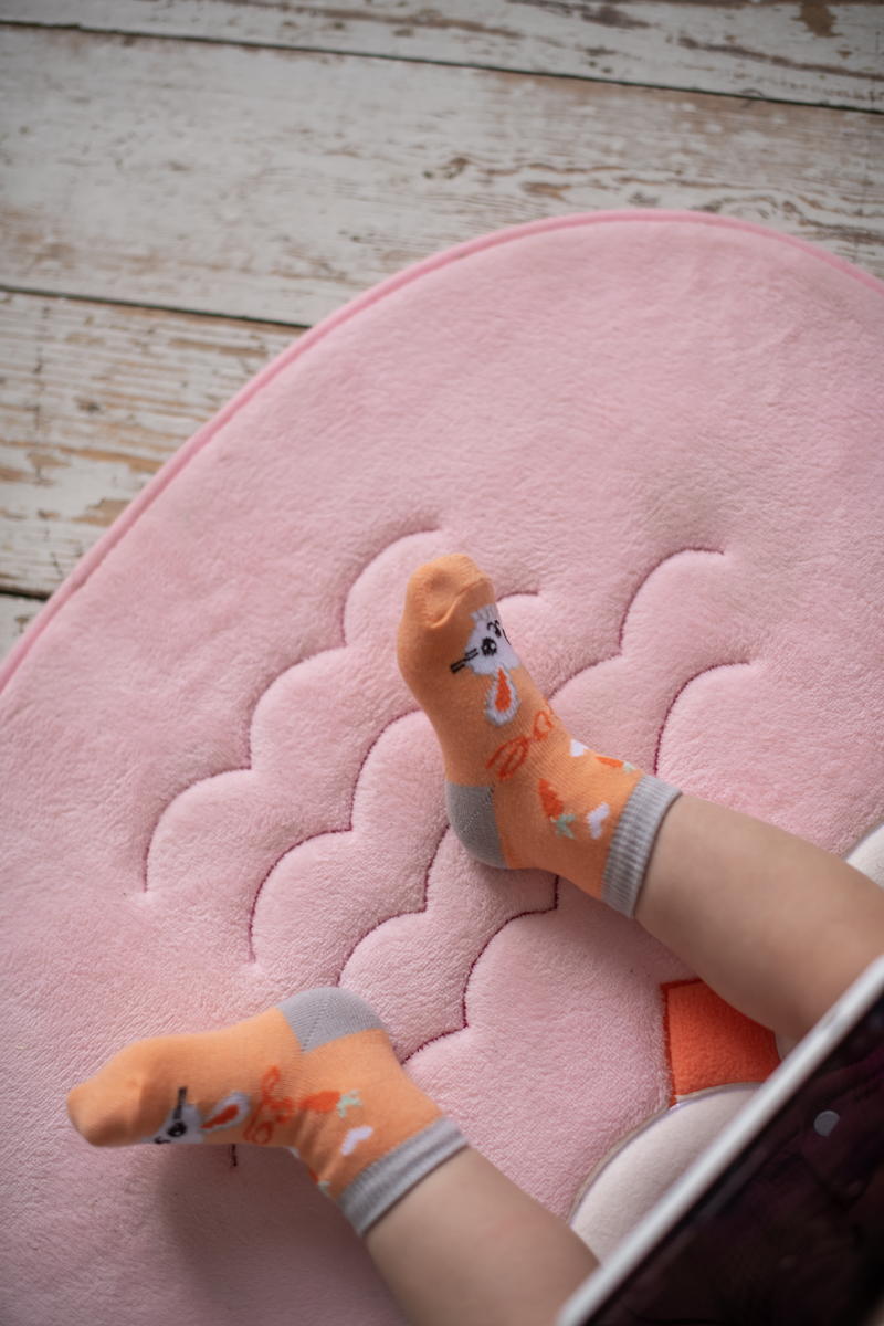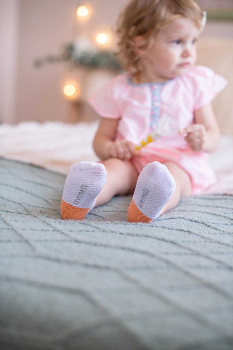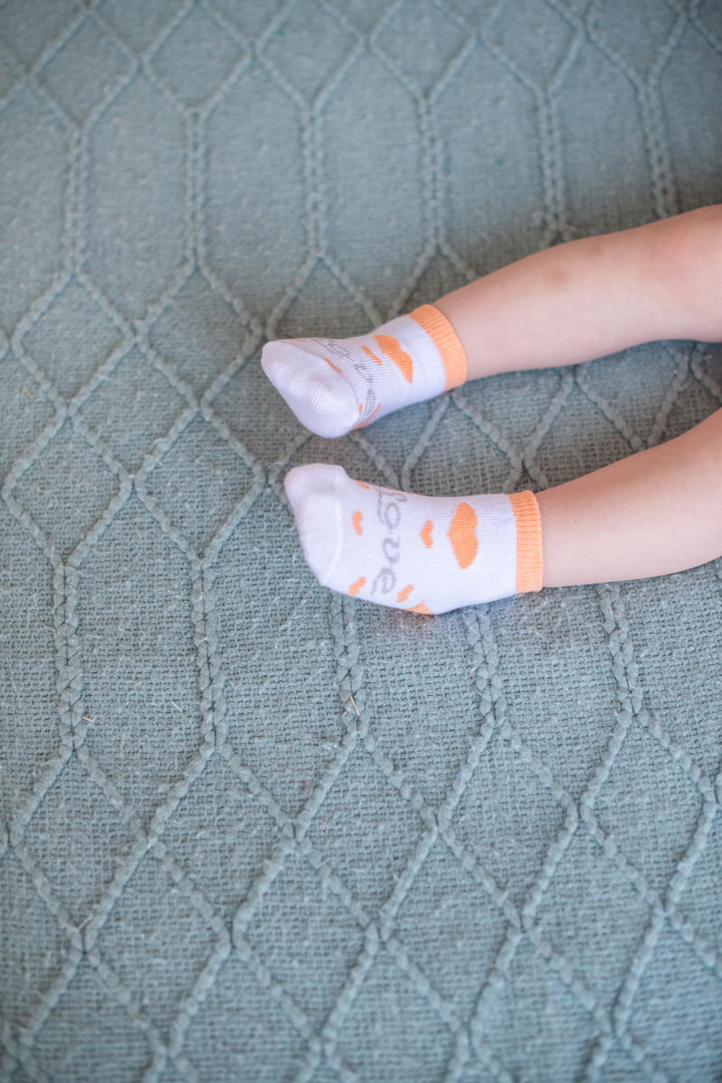 Нежно-белый цвет изделия в сочетании с оранжевым, с красочным рисунком выглядит очень привлекательно. Комплект состоит из 2 пар, которые отличаются по дизайну, но дополнят друг друга по цветовой гамме. Текстура носочка очень мягкая, нежная, что гарантирует вашему малышу комфорт при носке. Резинка не стягивает ножку, но при этом отлично фиксирует.