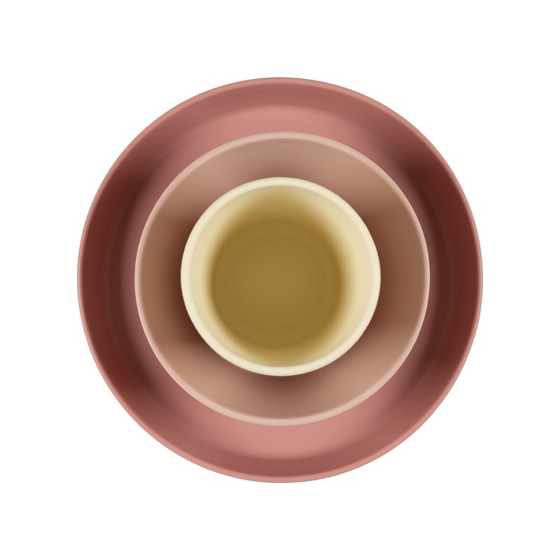 Крепкость пластика и тактильность силикона объединились в стильном наборе детской посуды.