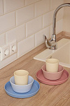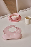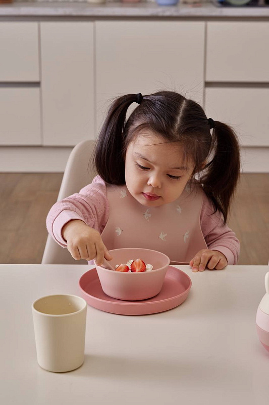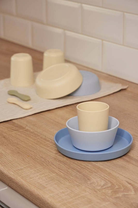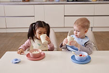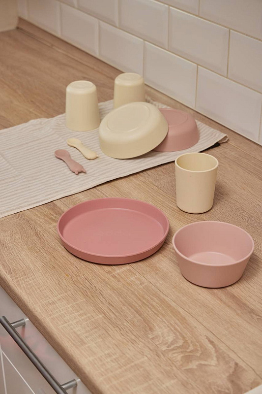 Крепкость пластика и тактильность силикона объединились в стильном наборе детской посуды.