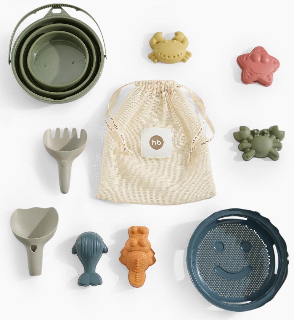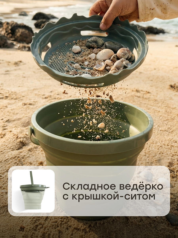 Комплектация Формочки - 5 шт., сито - 1 шт., грабли - 1 шт. совок - 1 шт., ведро - 1 шт., мешочек - 1 шт.