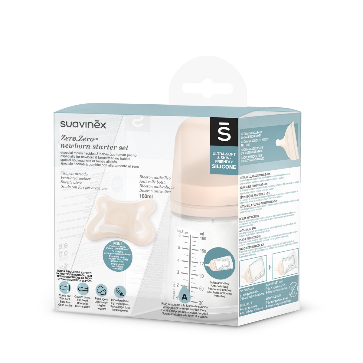 Детская бутылочка для кормления Suavinex Zero.Zero 180 мл с адаптивным потоком разработана для малышей с рождения. Она идеально подходит с первых дней жизни для смешанного кормления (грудным молоком и смесью, либо сцеженным грудным молоком из бутылочки) и искусственного вскармливания детской смесью.
