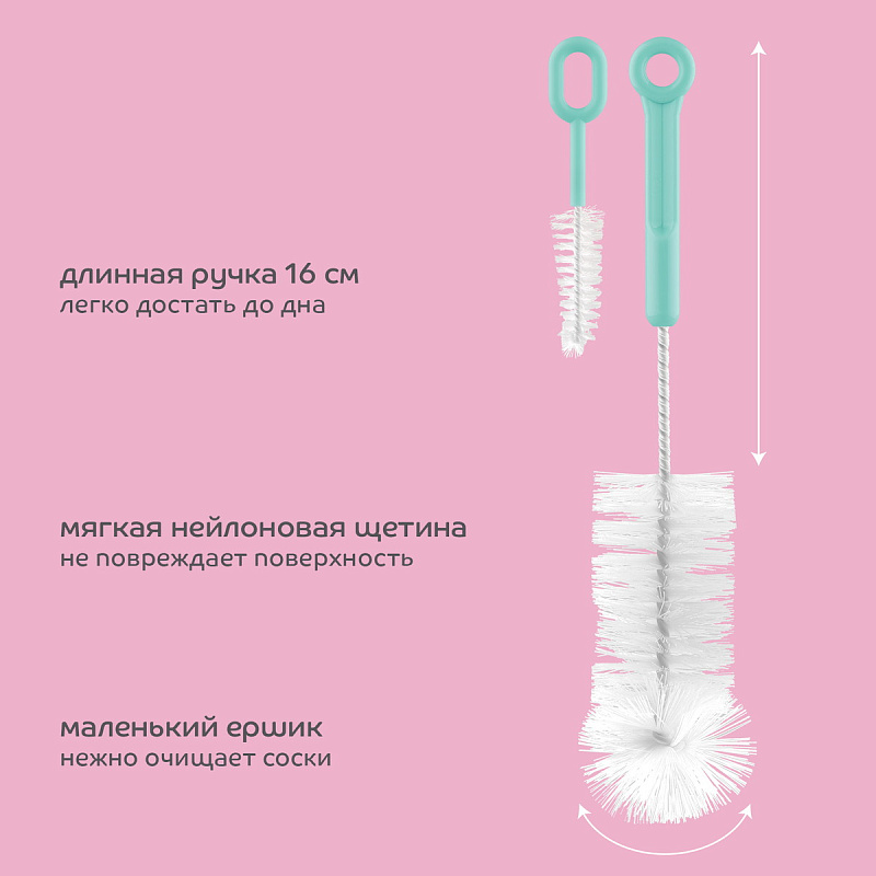 Набор ёршиков lubby для бутылочек и сосок используйется для эффективной очистки и мытья бутылочек, сосок, поильников. Большой ершик используется для очистки бутылочек, маленький - для сосок. На конце ершика имеется крючок для удобного хранения и сушки