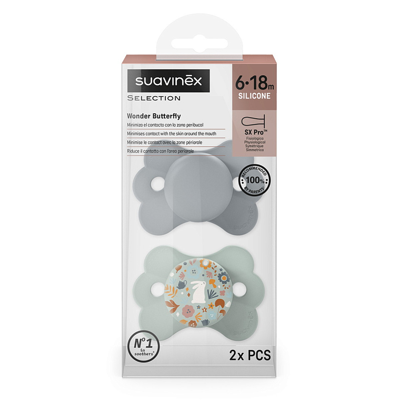 Пустышки выполнены из ультрамягкого силикона с пескоструйной обработкой и имеют плоскую симметричную соску SX Pro, которая анатомически правильно располагается во рту ребенка, не препятствуя естественному развитию ротовой полости и прикуса.