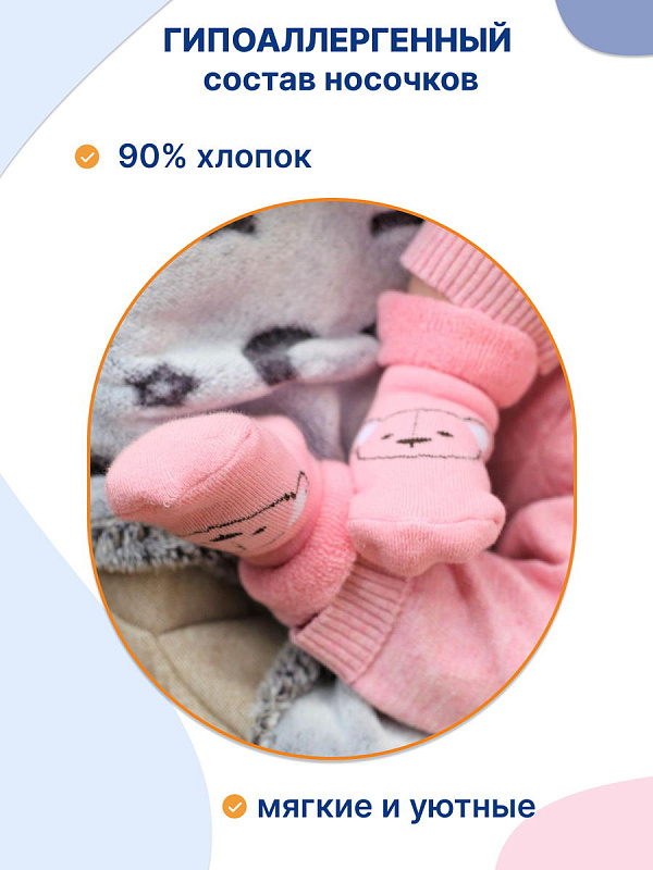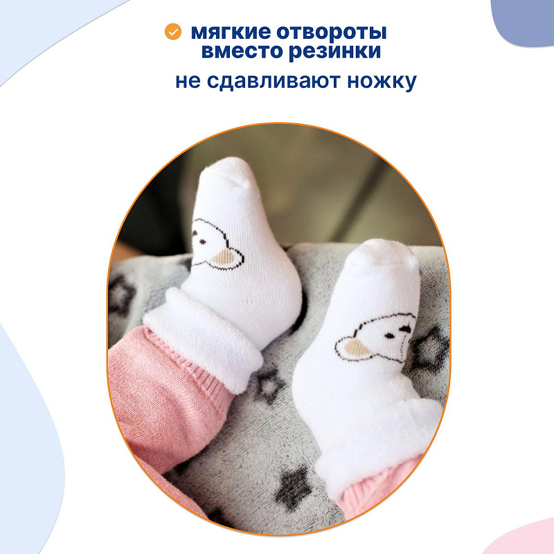 Нежный цвет изделий в сочетании с рисунком выглядит очень привлекательно. Комплект состоит из 2 пар, которые отличаются по дизайну с выдержанной цветовой гаммой. Текстура очень мягкая, нежная, что гарантирует вашему малышу комфорт при носке. Резинка совершенно не стягивает ножку, но при этом отлично фиксирует.