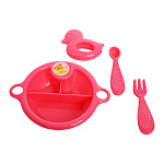 - в наборе: пупс в одежде, игрушка-погремушка, тарелка, ложка, вилка