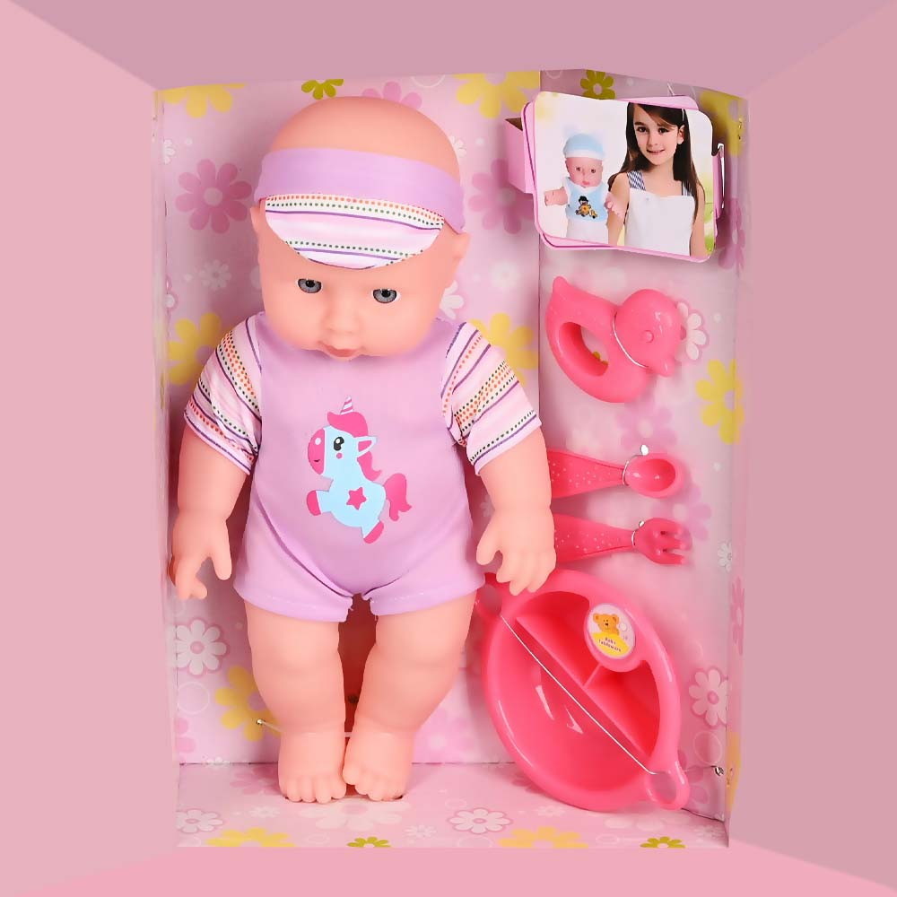 - в наборе: пупс в одежде, игрушка-погремушка, тарелка, ложка, вилка