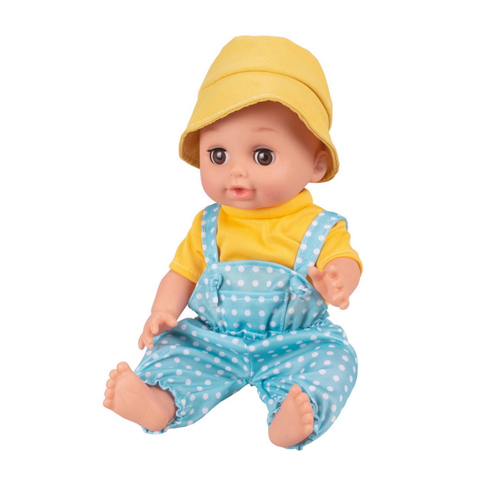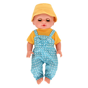 Симпатичный пупс в желтой шапочке порадует вашу малышку и доставит ей много удовольствия от часов, посвященных игре с ней. Кукла изготовлена из мягкой пластмассы. Этот малыш очень послушный: его легко приучить к гигиене, достаточно напоить пупса из бутылочки водой, а затем посадить на розовый горшок. Усадив в стул пупса можно покормить из ложечки. Куклу можно взять с собой на прогулку усадив его в прогулочную коляску. После прогулки он может отдохнуть в своей собственной кроватке.