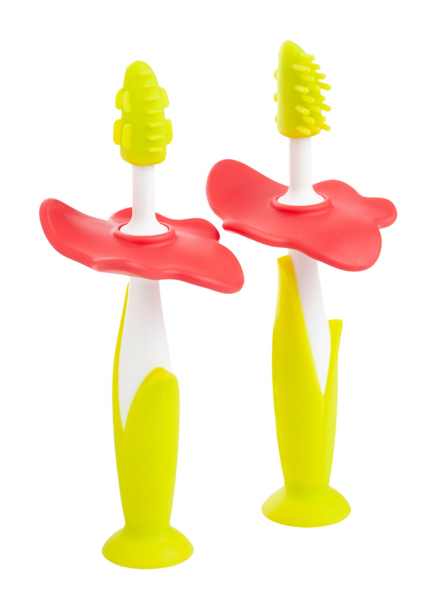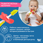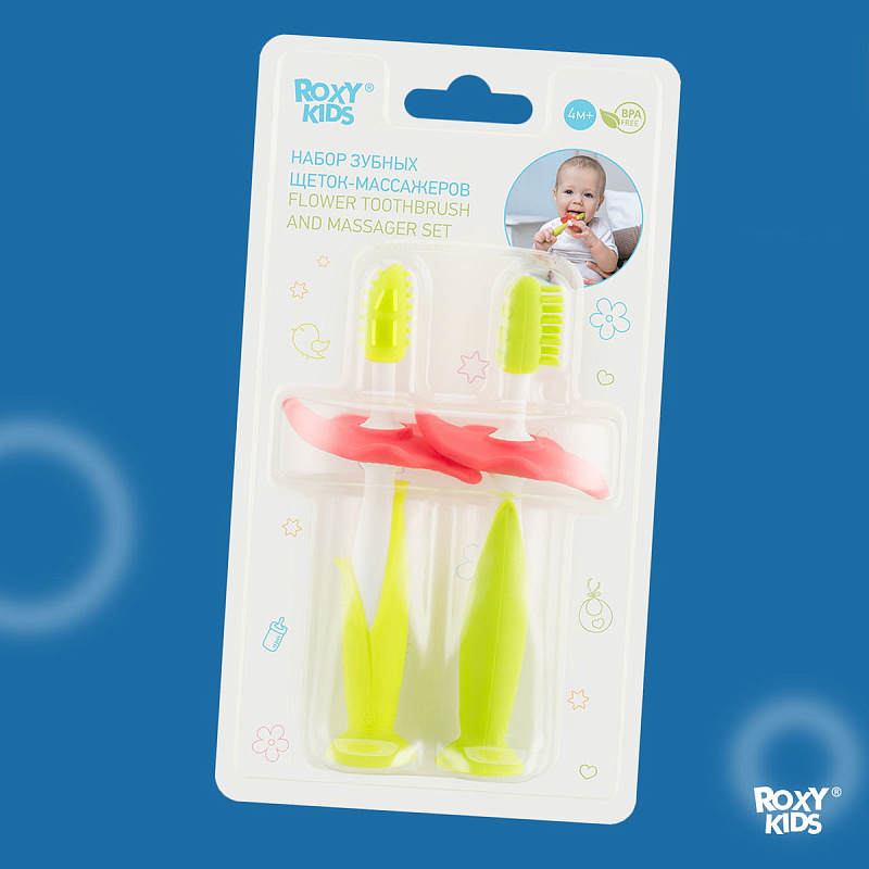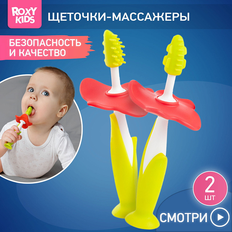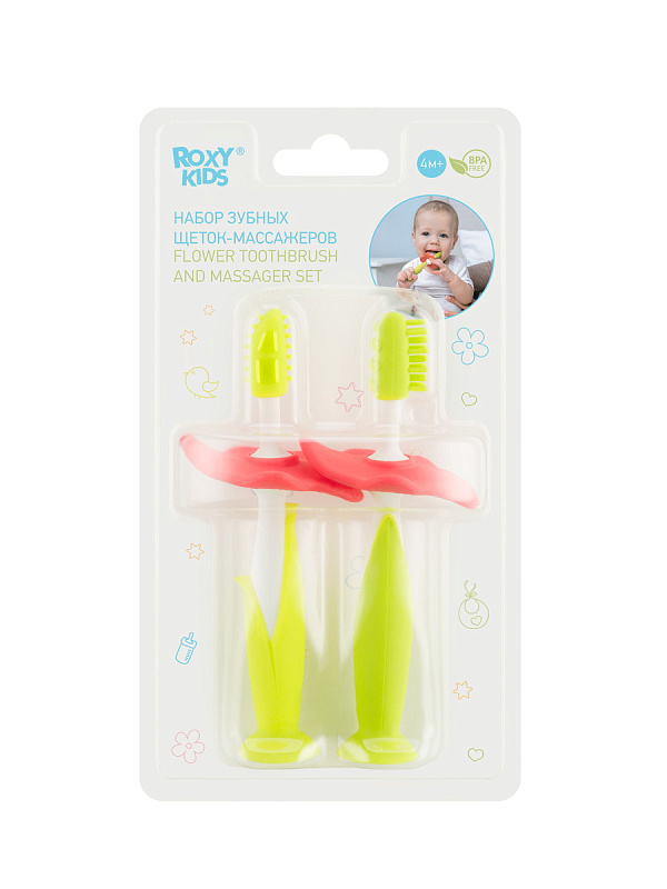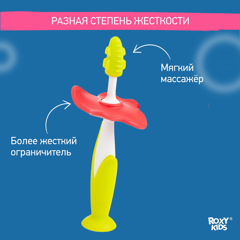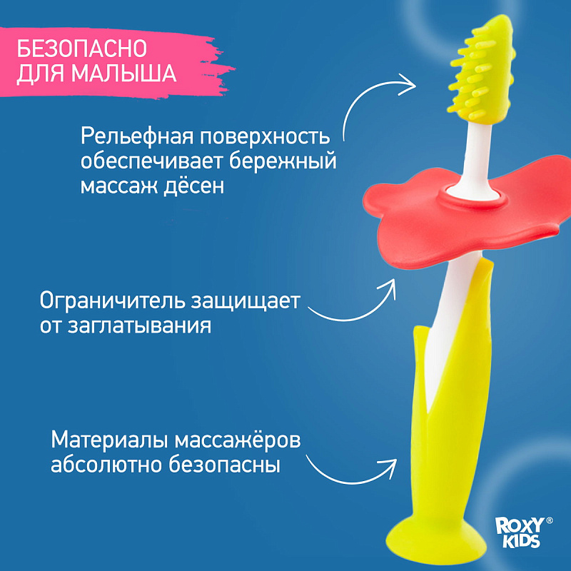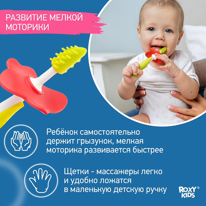 Набор зубных щеток-прорезывателей FLOWER от ROXY-KIDS предназначен для комфортного и безопасного ухода за полостью рта ребенка с первых месяцев жизни. Подходит для массирования раздраженных десен и чистки первых зубов. Ограничитель защищает малыша от заглатывания, снимается при необходимости Рельефная поверхность обеспечивает бережный массаж десен. Элементы разной степени жесткости, мягкий массажер и более жесткий ограничитель. Ребенок сам выбирает, какой элемент ему нравится грызть. Удобно хранить на присоске на различных поверхностях. Массажеры легкие и удобно ложатся в маленькую детскую ручку. Ребенок самостоятельно держит грызунок, мелкая моторика развивается быстрее. Ручка удобна и для взрослых, которые захотят почистить малышу его первые зубки. Прорезыватели просты в уходе, не скапливают на себе пыль, достаточно промыть теплой водой. Набор сертифицирован, материал гипоаллергенен и безопасен для детей.