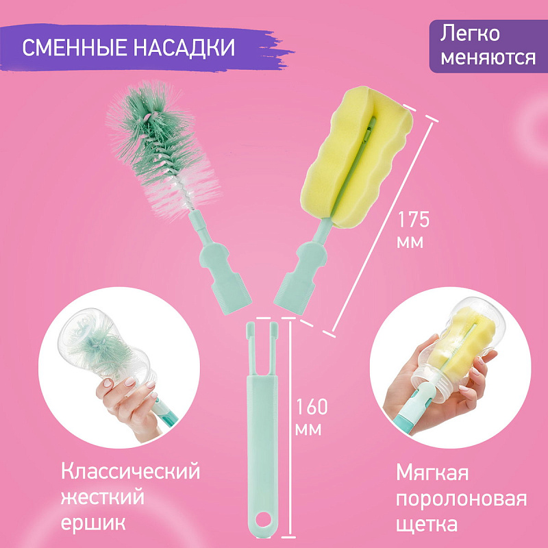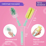 Набор щеток и ершиков ROXY-KIDS разработан специально для мытья бутылочек, трубочек, сосок и помогает сделать эту ежедневную процедуру максимально быстрой и удобной. В состав набора входят две сменные насадки для мытья бутылочек, маленькая щетка для соски и два мини-ершика для чистки трубочек. Классический жесткий ершик и мягкая поролоновая щетка предназначены для загрязнений разной степени. Они легко меняются и надежно защелкиваются на эргономичной рукоятке. Длина рукоятки 30 см позволяет почистить даже самые высокие бутылочки. Маленькая щетка повторяет форму соски, а ручку в форме кольца удобно держать, надев на палец. Мини-ершик – незаменимый инструмент для очистки силиконовых трубочек от остатков напитков. Он имеет оптимальный диаметр 5 мм и долговечную жесткую нейлоновую щетину.