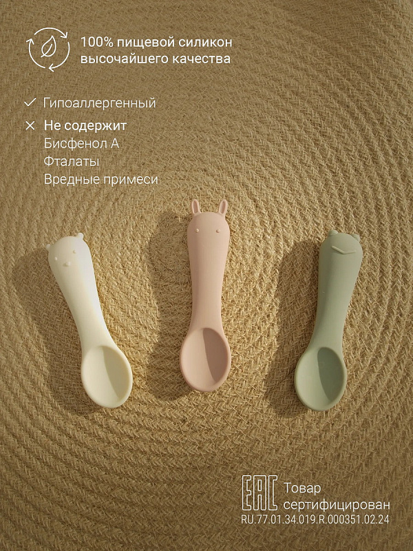Маленькие ложечки из пищевого силикона для первого знакомства ребёнка со столовыми приборами. Они мягкие и гибкие, ребёнок может сколько угодно грызть ложечки, не травмируя нёбо и дёсны.