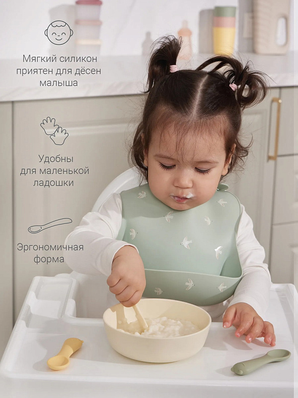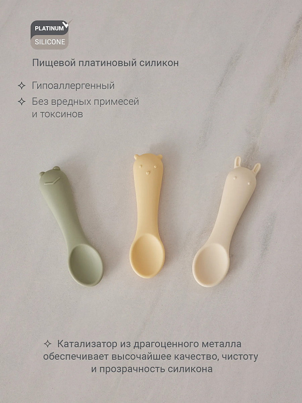 Маленькие ложечки из пищевого силикона для первого знакомства ребёнка со столовыми приборами. Они мягкие и гибкие, ребёнок может сколько угодно грызть ложечки, не травмируя нёбо и дёсны.