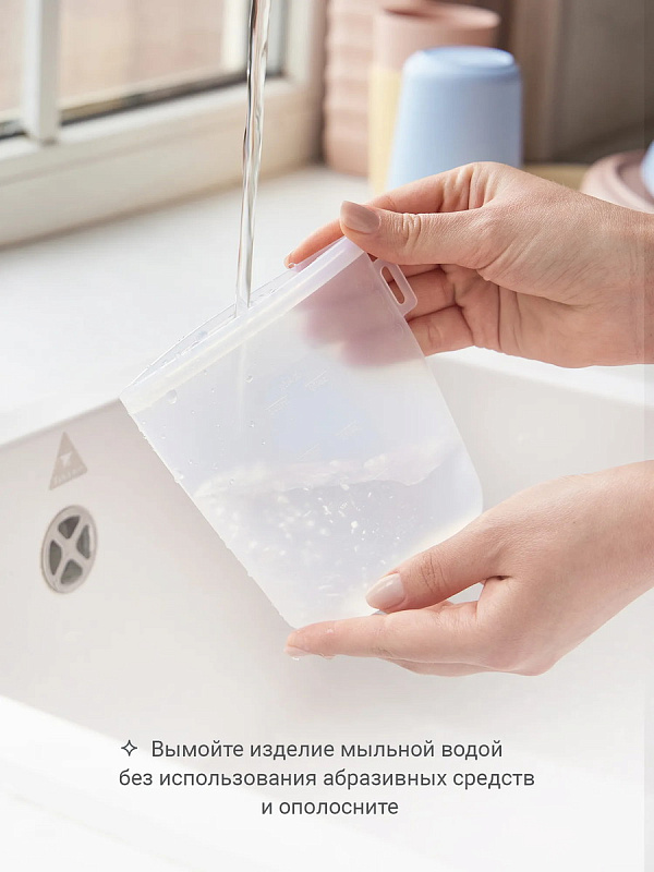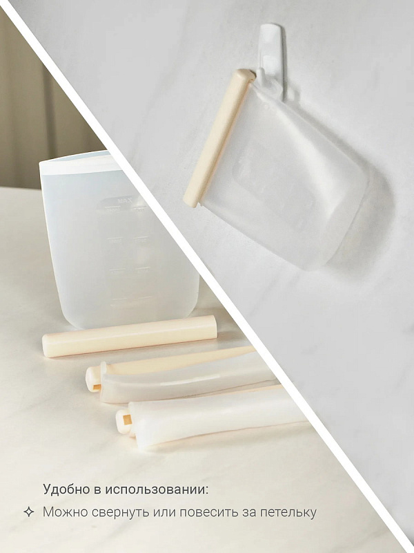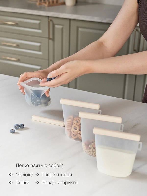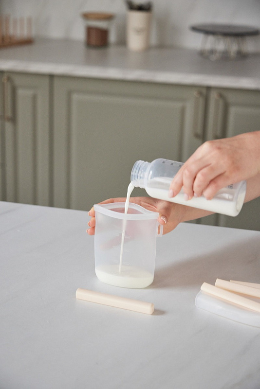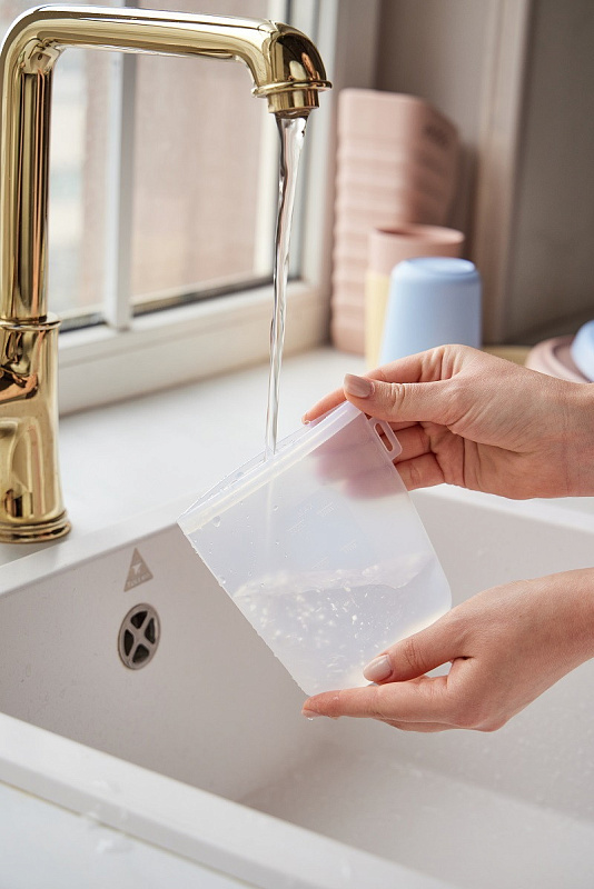 Молоко удобно переливать: у пакетов — широкое горлышко, оптимальный объём 240 мл и мерная шкала. Пакеты просто мыть, а когда малыш подрастёт, в них можно взять с собой перекус на прогулку. Для компактного хранения пакеты достаточно свернуть, убрать в шкаф или повесить на петельку.