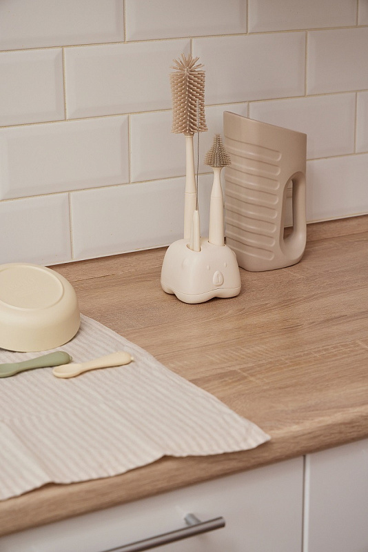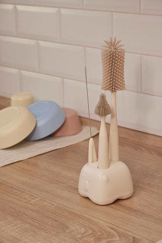 Щетинки из безопасного пищевого силикона деликатны к посуде, сохраняя её целостность. Они плавно двигаются и предотвращают появление микротрещин и размножение бактерий. Рельефная ручка ёршиков эргономична для комфорта во время мытья. Набор гармонично встраивается в стилистику современного дома. Ёршики можно мыть в посудомоечной машине и стерилизовать. Благодаря такому продуманному уходу посуда вашего малыша прослужит дольше.