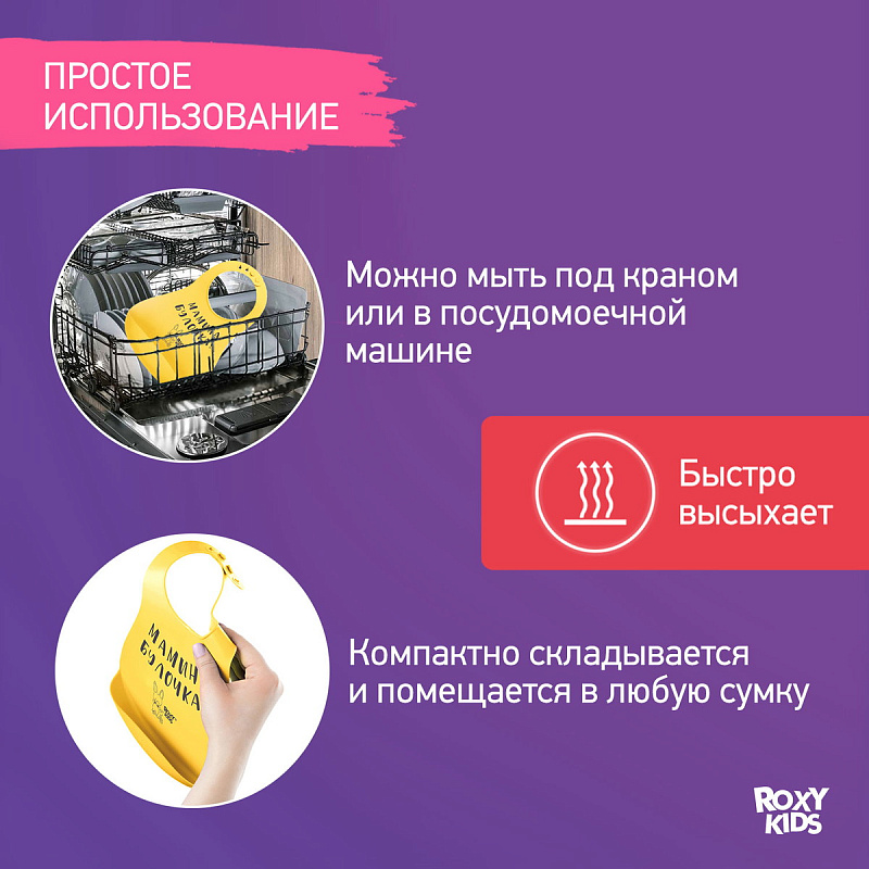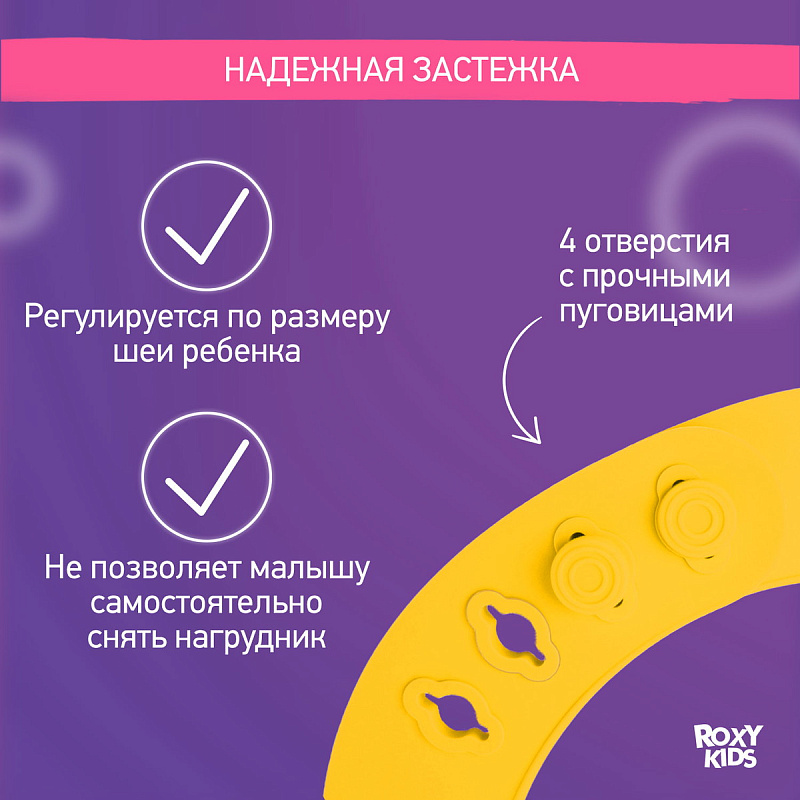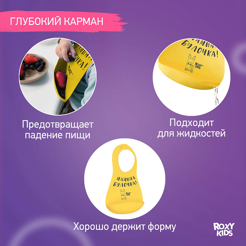 Нагрудник детский с карманом надежно защитит одежду вашего малыша от загрязнений и сохранит чистоту в доме. Мягкий на ощупь, но прочный материал не поцарапает и не натрет нежную шею ребенка. Нагрудник не впитывает запахи и легко моется даже в посудомоечной машине при температуре не больше 80 градусов Цельсия. Отличительной особенностью этого нагрудника является особая надежная застежка, которая позволяет регулировать размер аксессуара, а также не даст ребенку самостоятельно снять нагрудник с себя. Глубокий карман для крошек предназначен для того, чтобы еда не оказалась на столе или на полу. Эргономичная форма повторяет очертания тела малыша. Изготовлен полностью из гипоаллергенного материала. При необходимости слюнявчик можно легко свернуть в трубочку и взять с собой. Материал не деформируется в процессе использования. В ассортименте ROXY-KIDS данный нагрудник представлен в нескольких цветах.