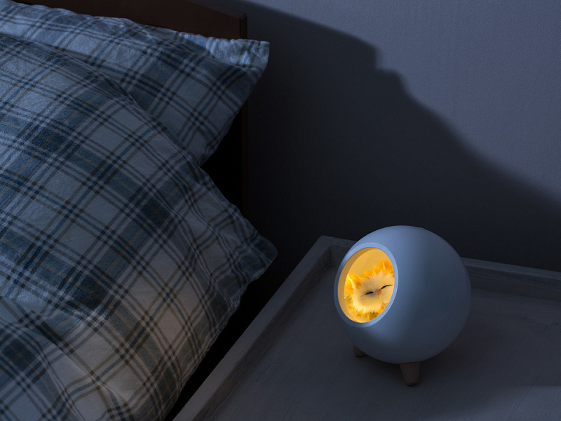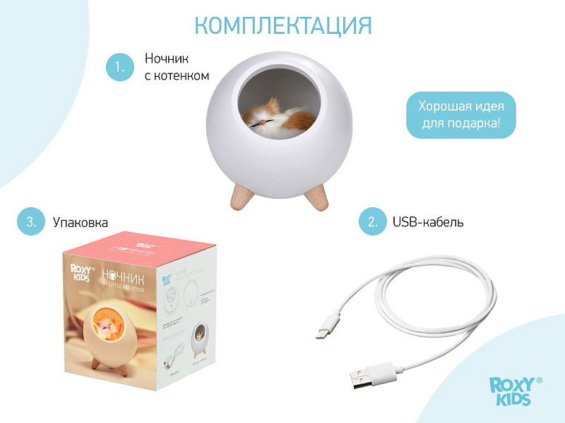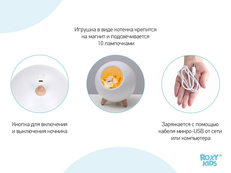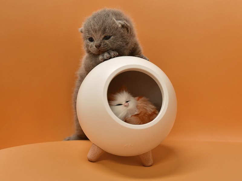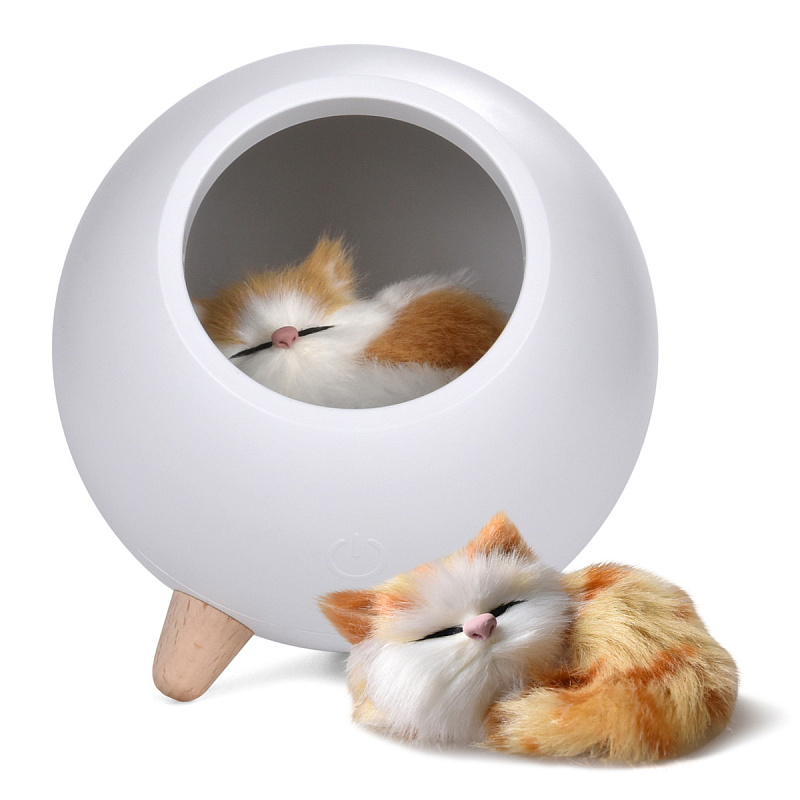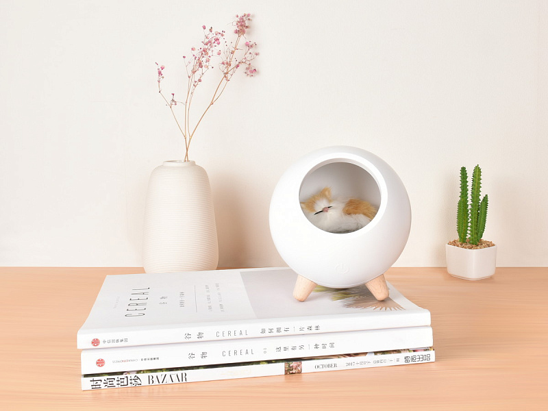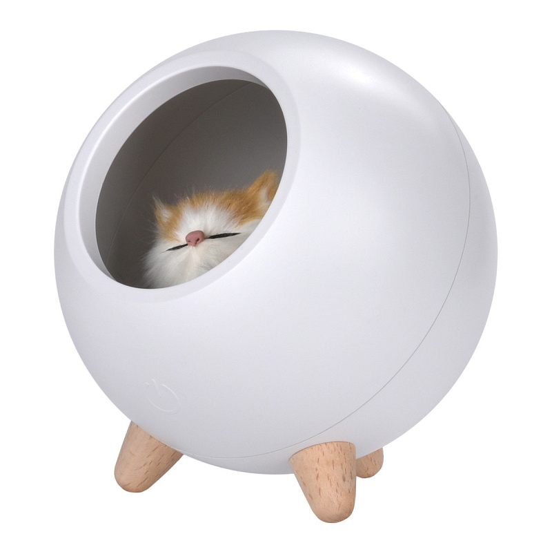 Детский ночник с мягким рассеянным светом и простым минималистичным дизайном в виде домика для котенка украсит спальню ребенка и сделает любой интерьер уютнее. Фигурка котика внутри ночника сделана вручную. Котенок крепится на магнит и легко вынимается для игр. 10 LED-лампочек обеспечивают равномерное свечение. Ночник снащен диммером для плавной ступенчатой регулировки яркости. Встроенный 1200 мАч литий-ионный аккумулятор обеспечивает возможность работы без подзарядки около 20 часов. Ночник заряжается при помощи комплектного кабеля микро-USB от сети или компьютера. Световой индикатор позволяет определить, когда ночник полностью заряжен. Управление осуществляется одной кнопкой в задней части корпуса.