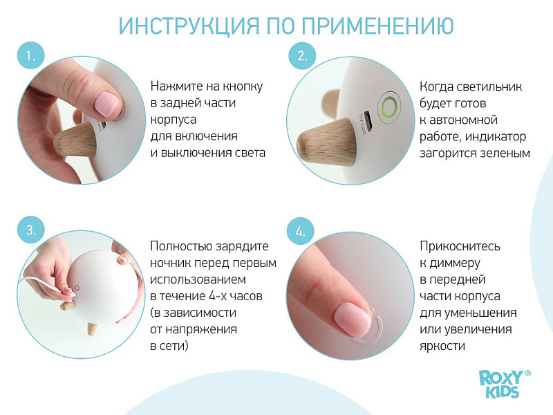 - Заряжается при помощи кабеля микро-USB от сети или компьютера. Световой индикатор позволяет определить, когда ночник полностью заряжен