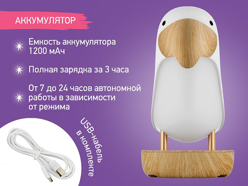Декоративный интерьерный ночник в виде тукана создаст особую атмосферу в комнате ребенка и сделает любой интерьер уютнее. Благодаря приветливому дизайну ночник поднимает настроение малышу, успокаивает и помогает заснуть. Плавная регулировка яркости позволяет настроить нужную интенсивность света, последняя настроенная яркость сохраняется в памяти ночника. Ночник поддерживает два режима: режим постоянного свечения и режим медленного мерцания. Встроенный аккумулятор емкостью 1200 мАч обеспечивает долгое время автономной работы ночника. Ночник заряжается при помощи кабеля USB Type-C, что делает процесс зарядки очень удобным. Световой индикатор позволяет определить, когда ночник полностью заряжен. В комплект входит подробная инструкция на русском языке. Ночник поставляется в яркой премиальной упаковке, поэтому идеально подходит для подарка!