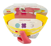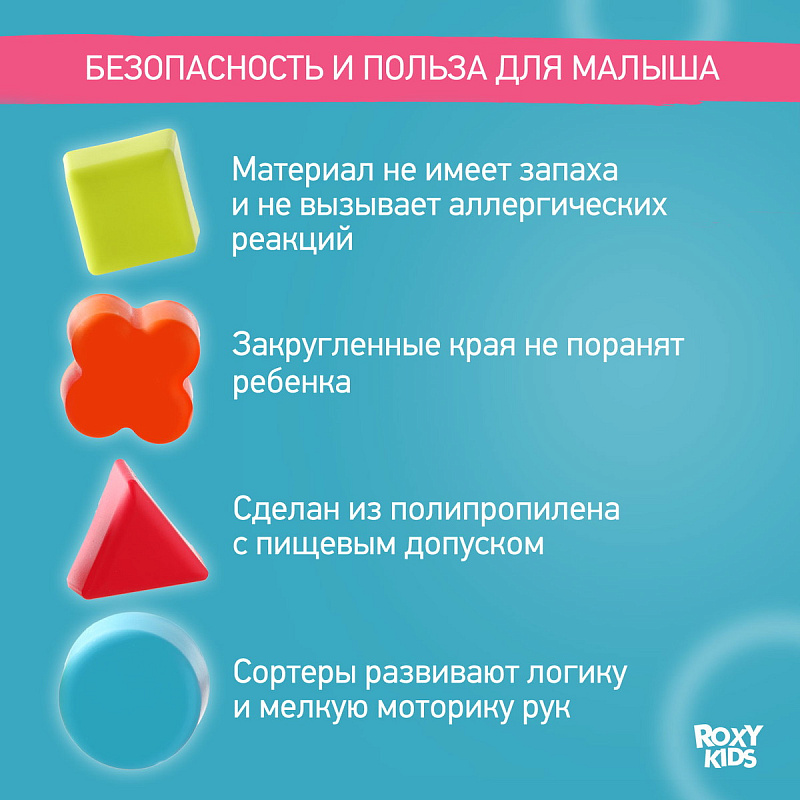 - может использоваться в качестве развивающей игры - 4 отверстия выполнены в виде фигур, и в комплект включены 4 сортера