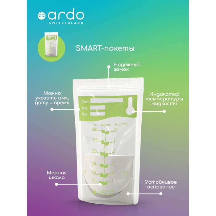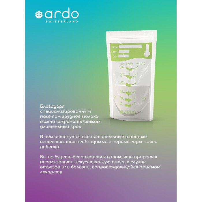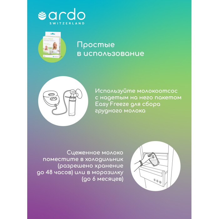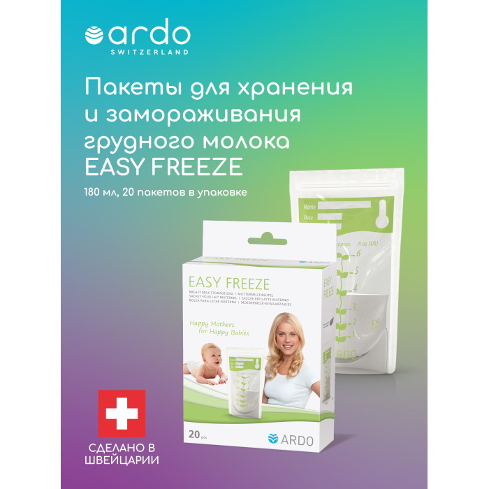 Ardo Пакеты для замораживания грудного молока Easy Freeze из неокрашенной полиэтиленовой пленки с печатью и верхним зажимом.
