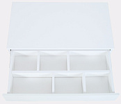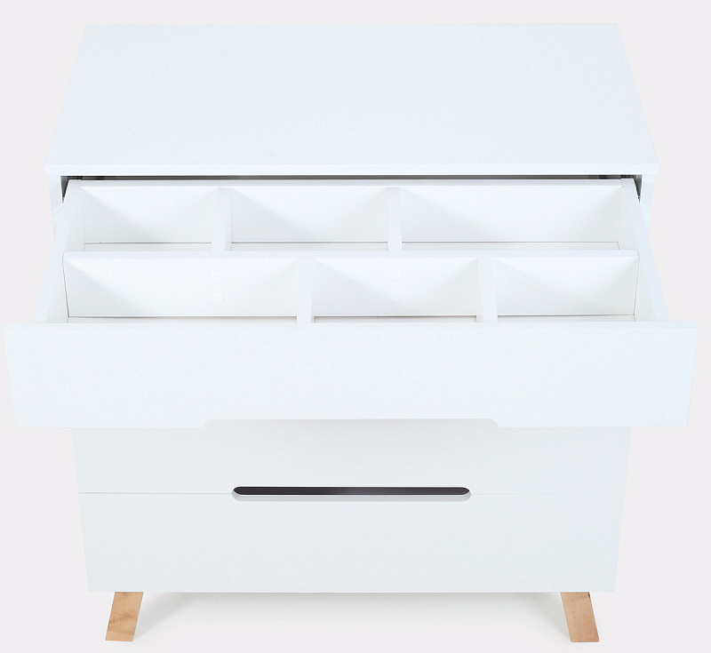 верхний ящик комода поделен на 6 разноформатных секций, куда так удобно сложить все необходимые вещи для ухода за младенцем (подгузники, одноразовые пеленки, детскую косметику для тела)