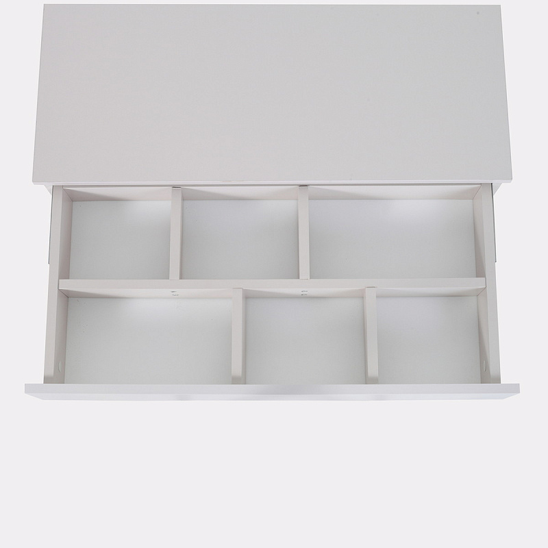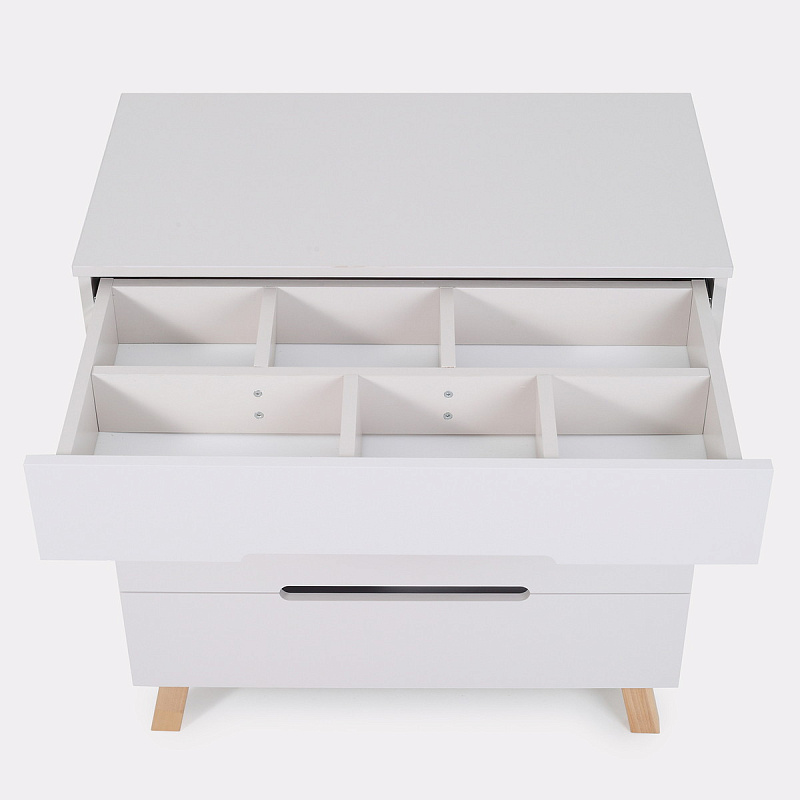верхний ящик комода поделен на 6 разноформатных секций, куда так удобно сложить все необходимые вещи для ухода за младенцем (подгузники, одноразовые пеленки, детскую косметику для тела)
