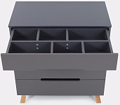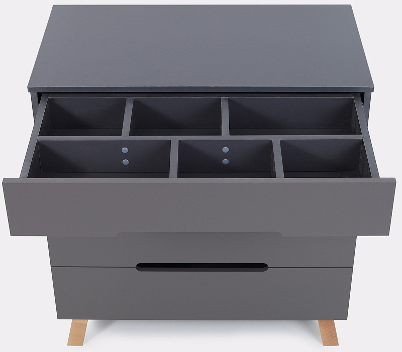 верхний ящик комода поделен на 6 разноформатных секций, куда так удобно сложить все необходимые вещи для ухода за младенцем (подгузники, одноразовые пеленки, детскую косметику для тела)
