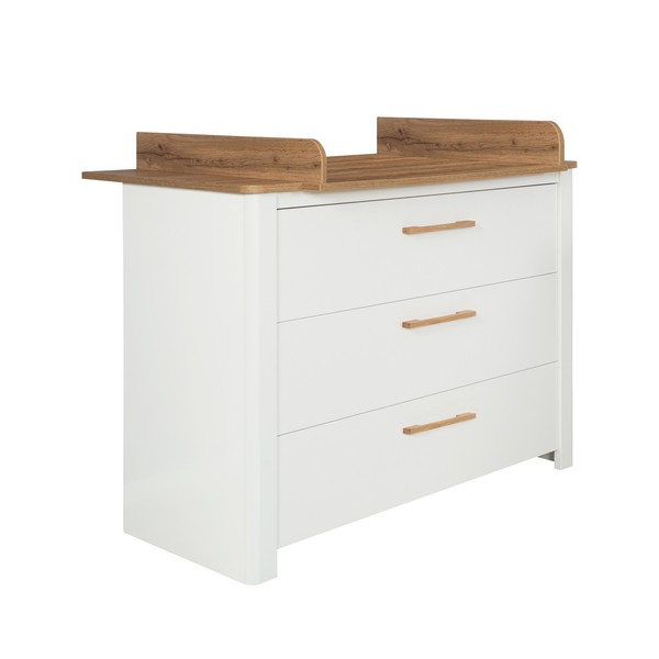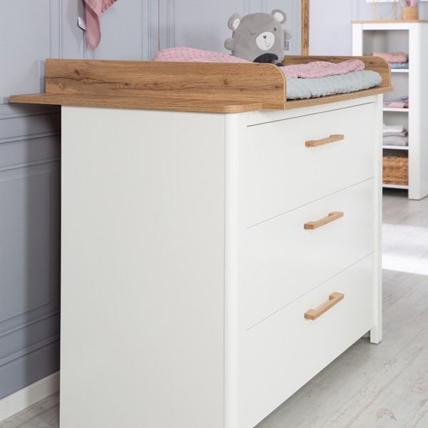 - Вместительный пеленальный комод имеет элегантные ручки из массива дуба, белые закругленные фасады и столешницу из дуба.