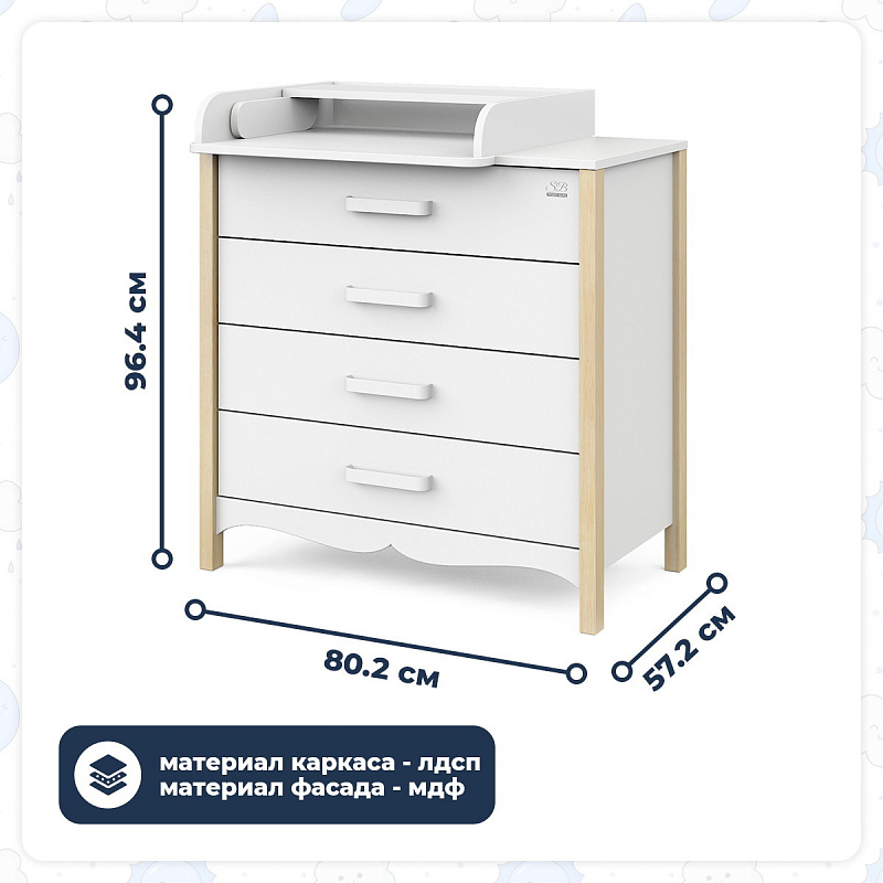 Корпус детского пеленального комода Sweet Baby Maestro изготовлен из ЛДСП цвета «Аляска белая».
