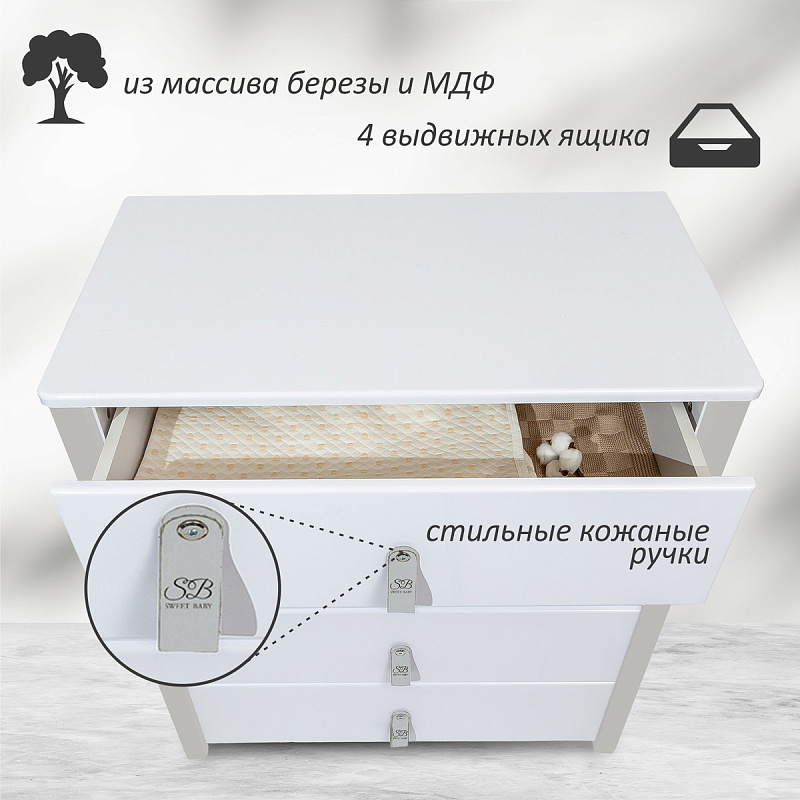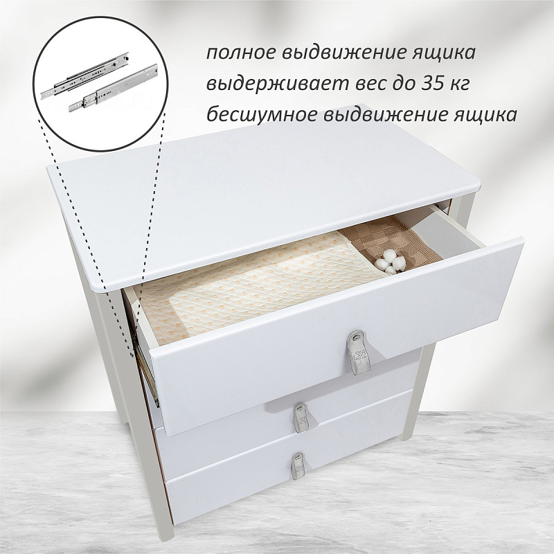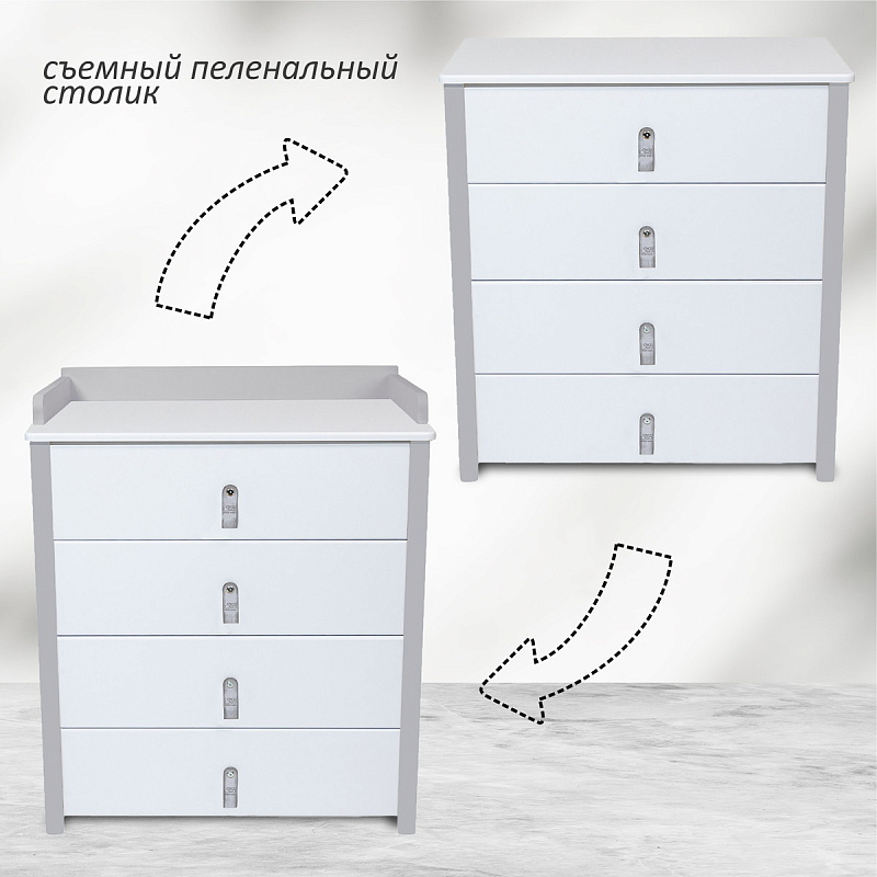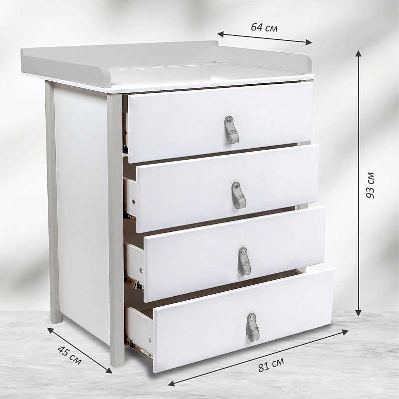 Красивый и стильный комод выполненный в скандинавском стиле. Комод оригинально смотрится и прекрасно впишется в любой интерьер. Пеленальная поверхность легко снимается, превращая комод в полноценное место для хранения вещей. Современные лакокрасочные материалы, использованные в отделке, нетоксичны и долговечны, а конструкция не имеет острых углов, что не только «смягчает» ее очертания, но и бережет малыша от случайных травм.