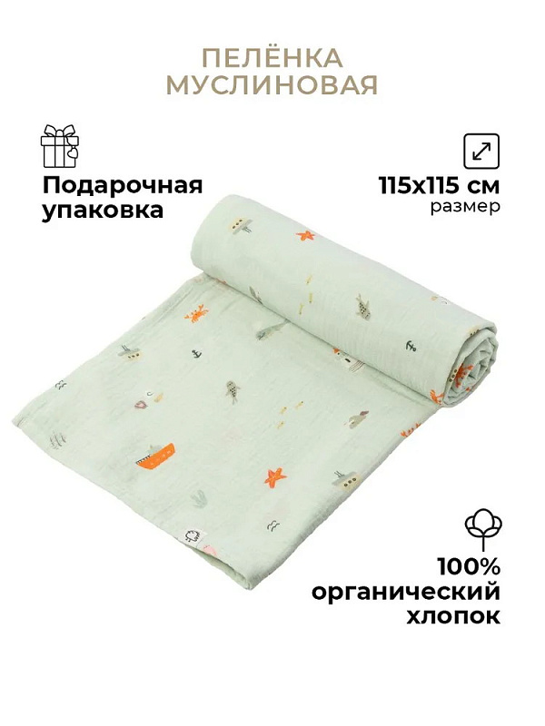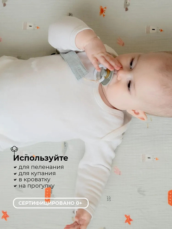 Муслиновая пелёнка выполнена из органического хлопка. Лёгкая воздухопроницаемая ткань идеально подходит для нежной детской кожи: мягкая и приятная к телу, хорошо впитывает влагу и быстро сохнет, не вызывает аллергических реакций.