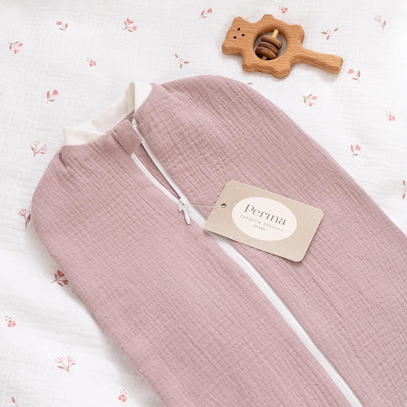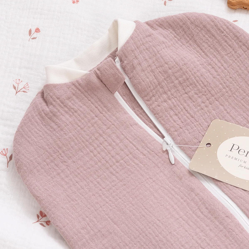 Материал кокона - высококачественный двухслойный жатый муслин, 100% эко хлопок. Он легкий, воздушный и невероятно приятный на ощупь. Муслин прекрасно впитывает влагу, быстро сохнет и сохраняет свою мягкость и цвет даже после множества стирок. Подкладка спальника выполнена так же из двухслойного муслина. Все швы спрятаны внутрь, что делает использование спальника более комфортным и безопасным.