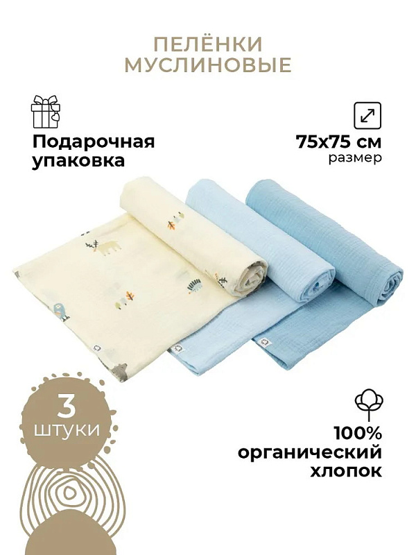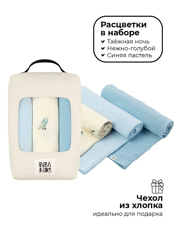 Пелёнки муслиновые Buba Kids, 3 шт, 75х75 см BKMUSSW10 Таёжная ночь/ нежно-голубой/ синяя пастельНет оценокХарактеристики