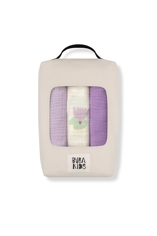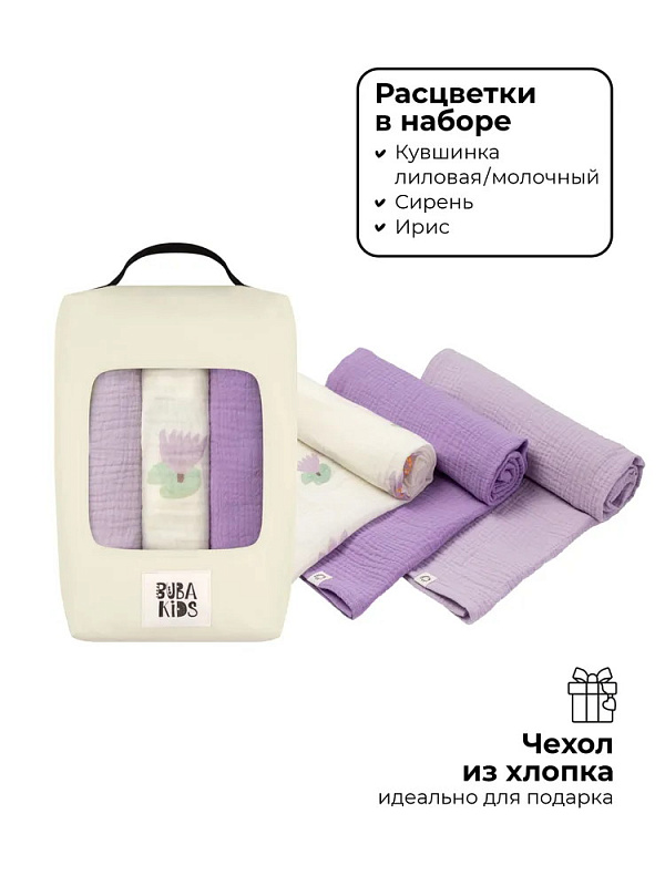 Пелёнки муслиновые Buba Kids, 3 шт, 75х75 см BKMUSSW23IV Кувшинка лиловая на молочном/ сирень/ ирис