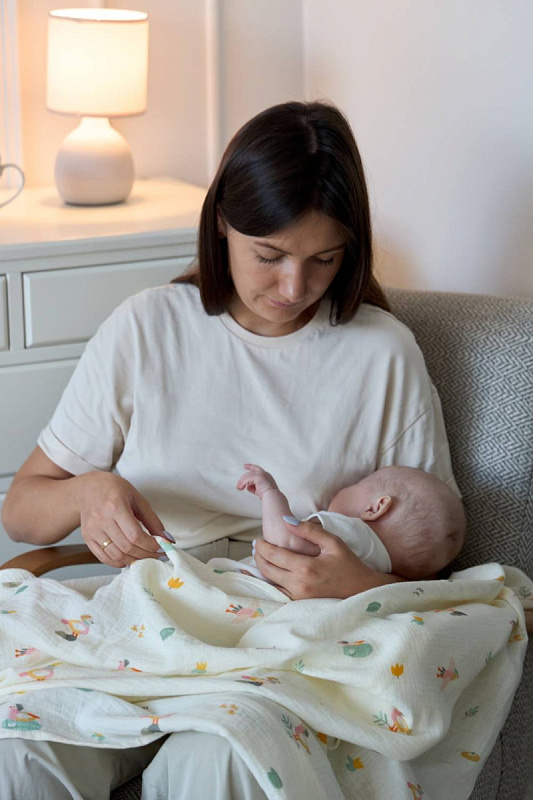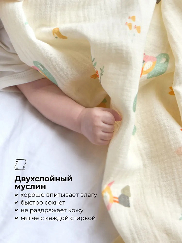 Муслиновая пелёнка выполнена из органического хлопка. Лёгкая воздухопроницаемая ткань идеально подходит для нежной детской кожи: мягкая и приятная к телу, хорошо впитывает влагу и быстро сохнет, не вызывает аллергических реакций.