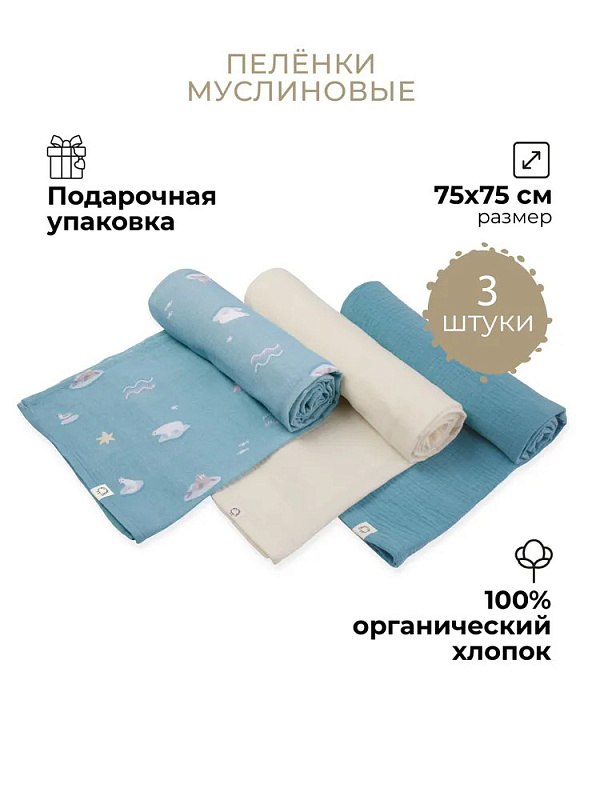 Пелёнки муслиновые Buba Kids, 3 шт, 75х75 см BKMUSSW41 Русская Арктика/ сливочный/ туманное утроНет оценокХарактеристики