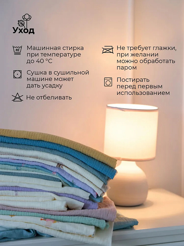Несмотря на свою воздушность, муслин прочный и долговечный, с каждой стиркой становится только мягче. Пелёнки изготовлены с плоскими деликатными швами и с использованием безопасных натуральных красителей.